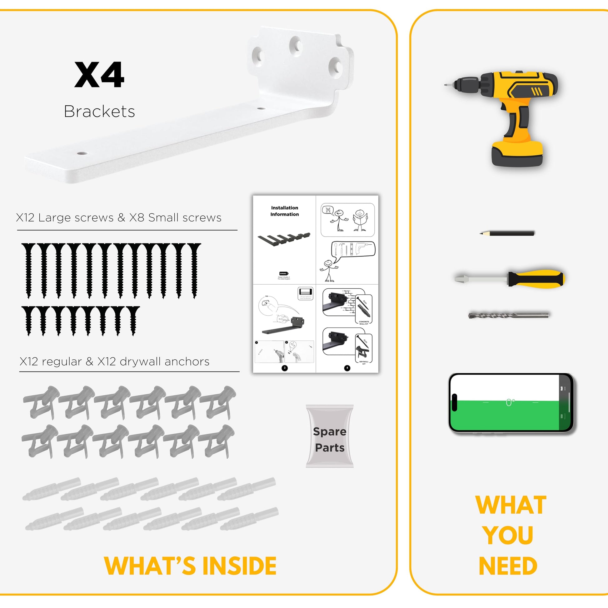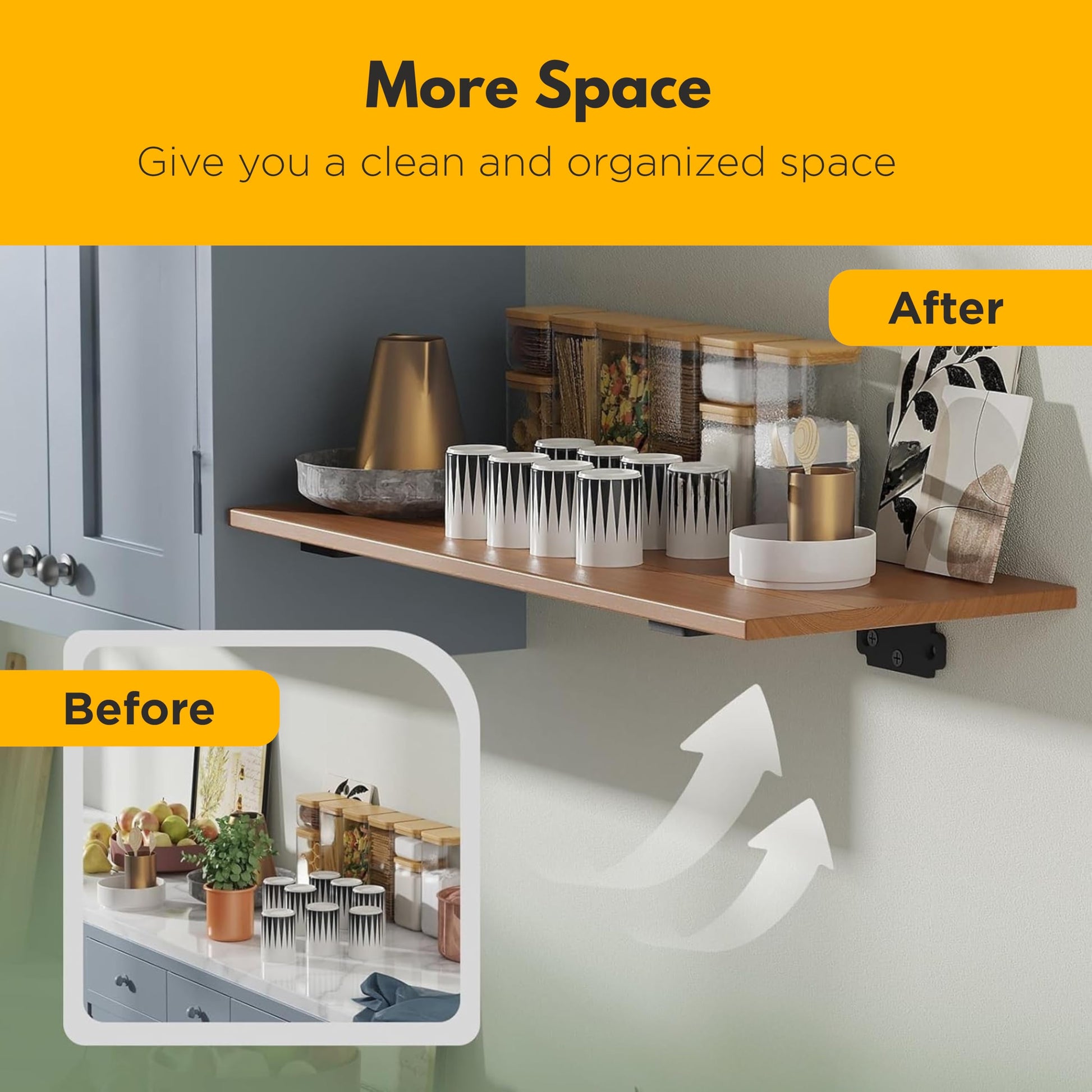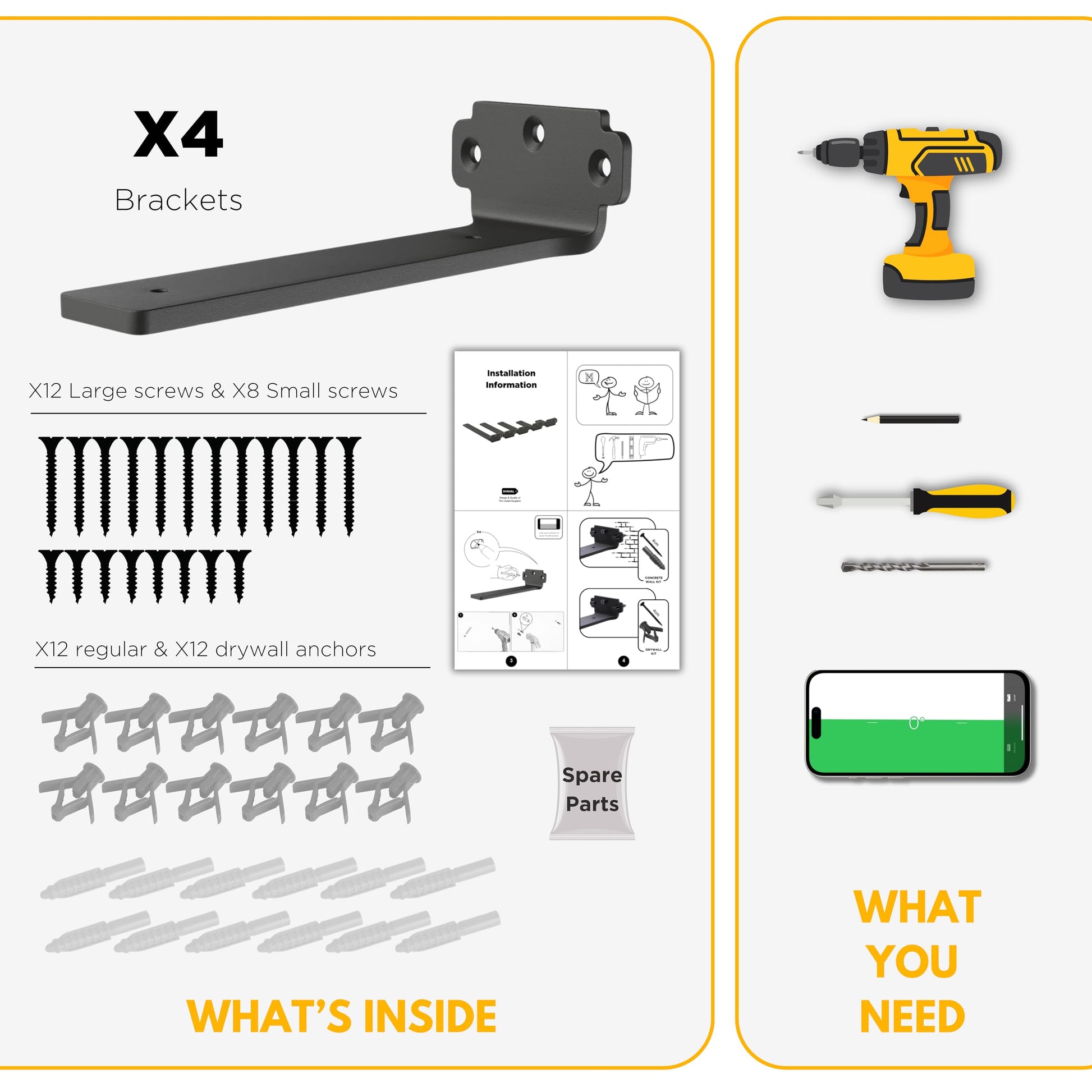 These heavy-duty floating shelf brackets are made from rust-resistant iron and support up to 77 kg, providing secure and stable shelving. With a precision 90° bending design, they ensure your shelves remain level and won't tip. Perfect for storage spaces, garages, and other high-demand areas, these wall-mounted brackets fit shelves between 10-30 cm wide and 0.5 cm thick. Ideal for mounting on wood, plaster, and concrete walls, they are great for organizing tools, equipment, and supplies. Easy to install, the brackets come with all necessary hardware and a level for accurate alignment. (Boards not included.)