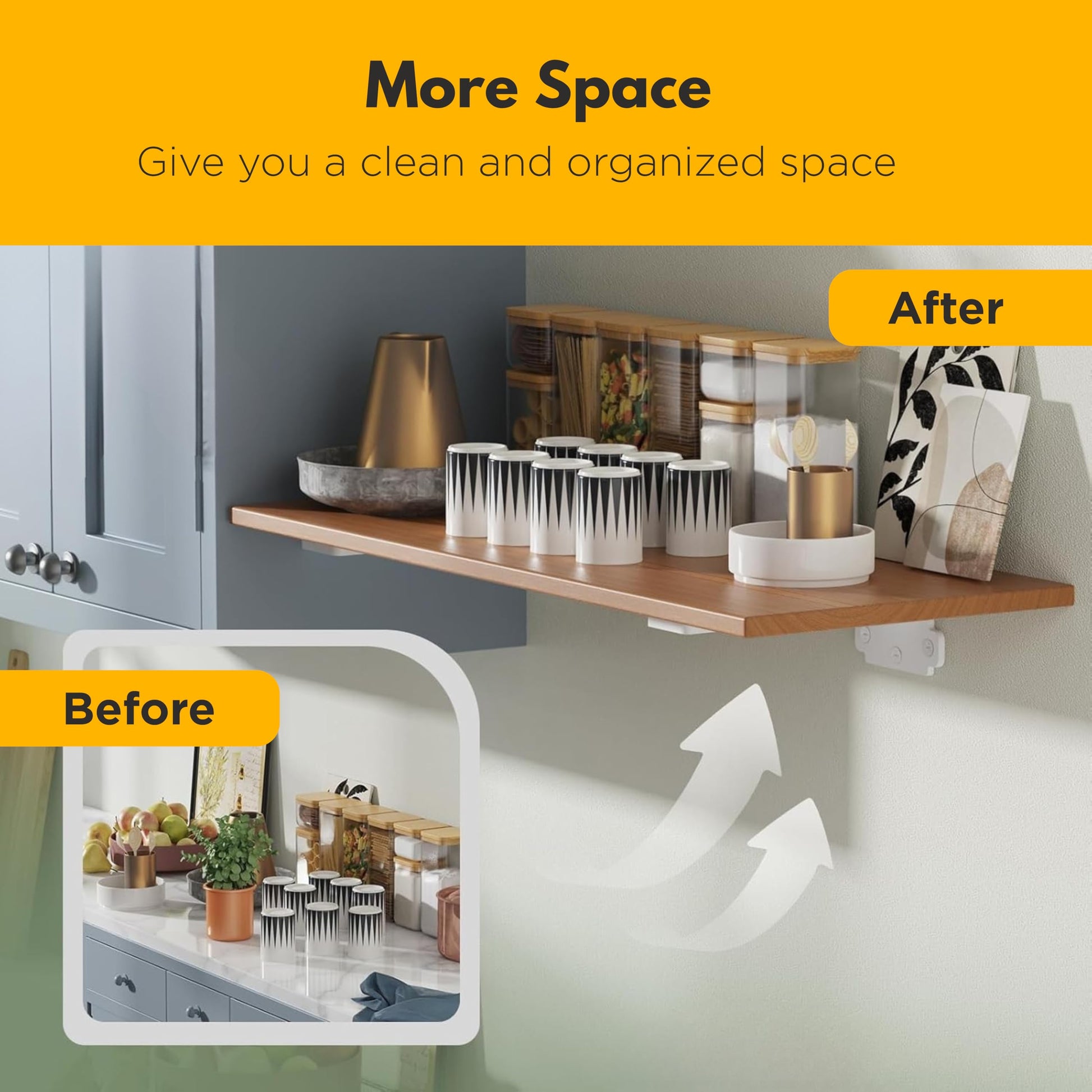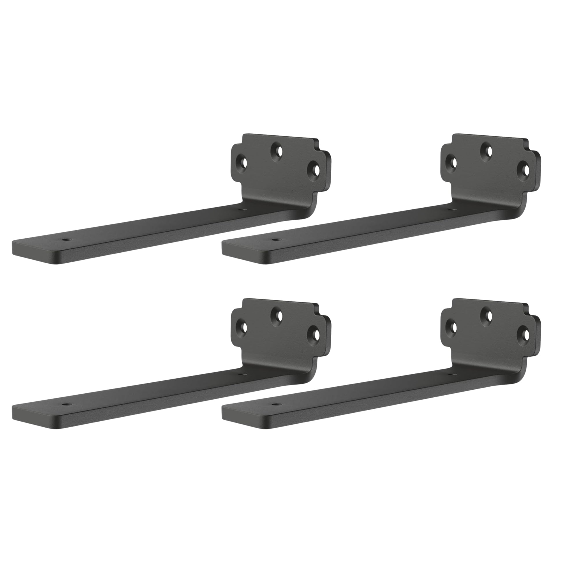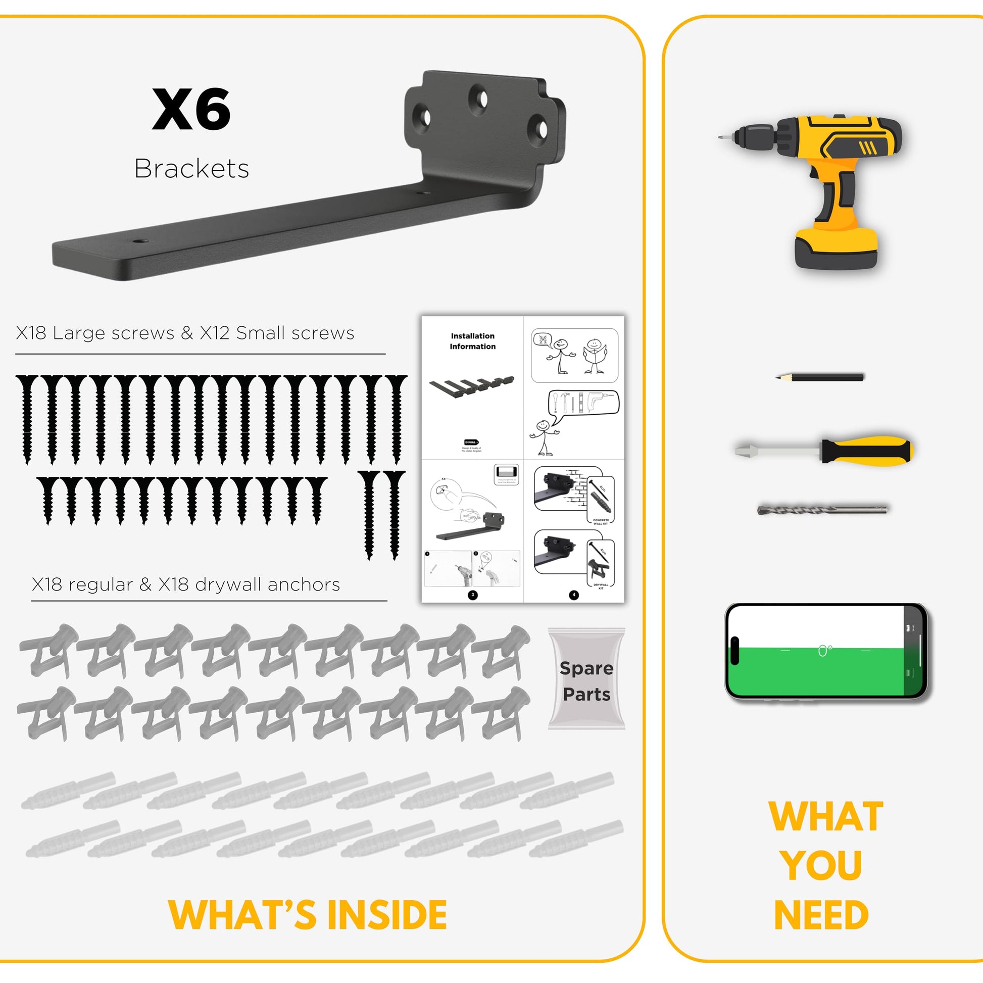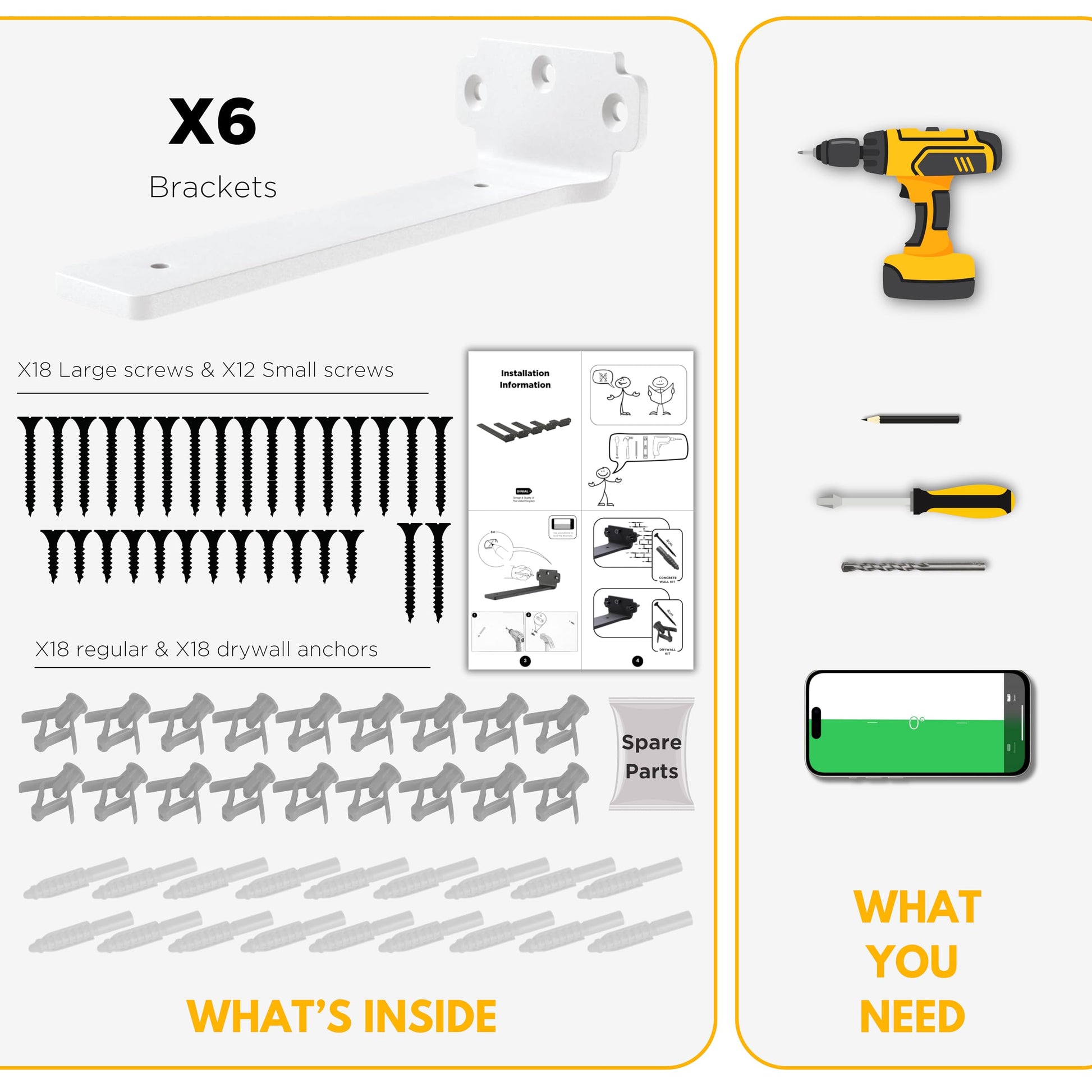 These heavy-duty floating shelf brackets are made from rust-resistant iron and support up to 77 kg, providing secure and stable shelving. With a precision 90° bending design, they ensure your shelves remain level and won't tip. Perfect for storage spaces, garages, and other high-demand areas, these wall-mounted brackets fit shelves between 10-30 cm wide and 0.5 cm thick. Ideal for mounting on wood, plaster, and concrete walls, they are great for organizing tools, equipment, and supplies. Easy to install, the brackets come with all necessary hardware and a level for accurate alignment. (Boards not included.)