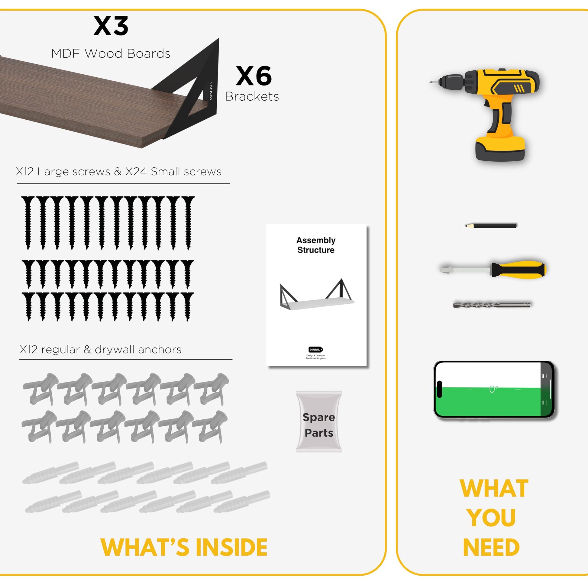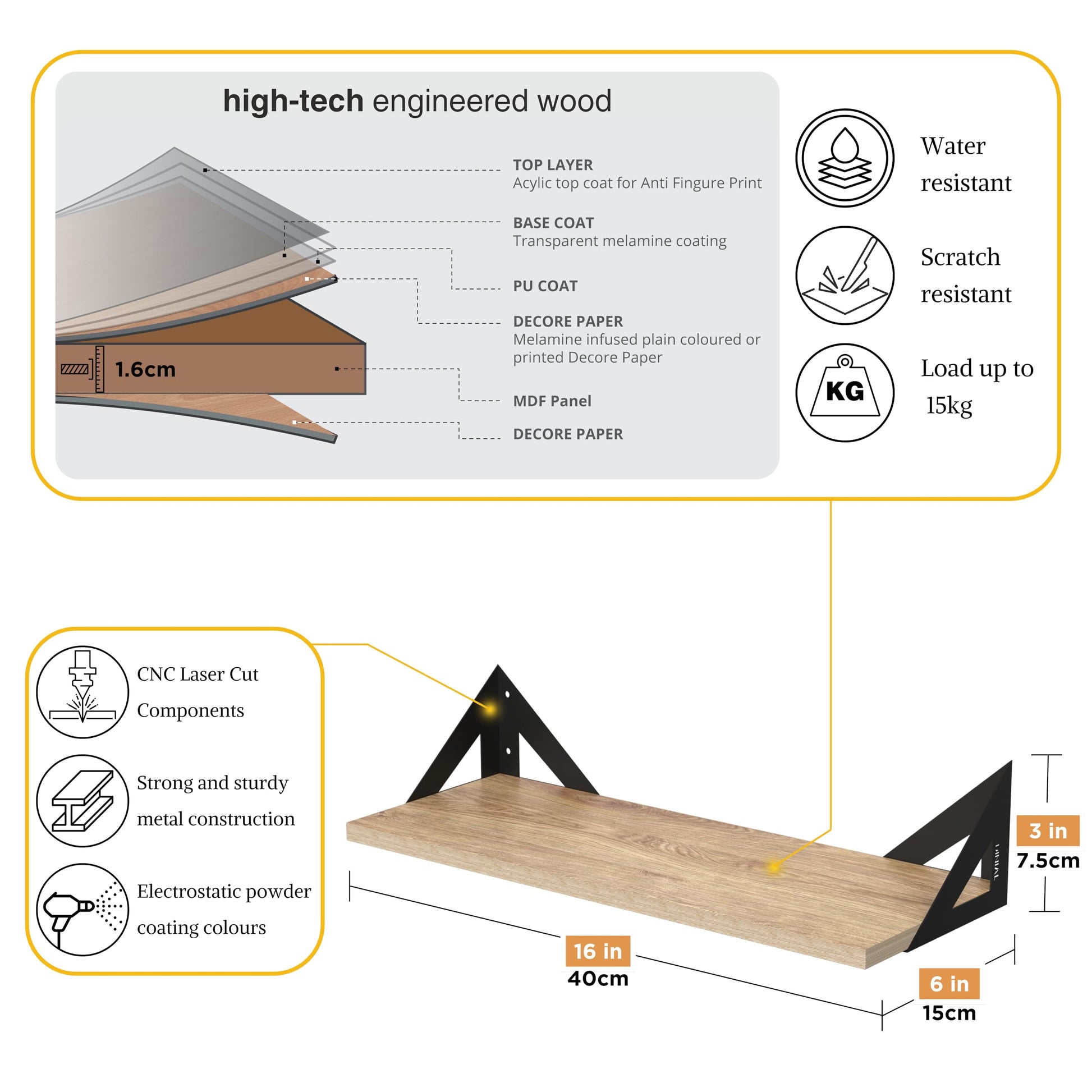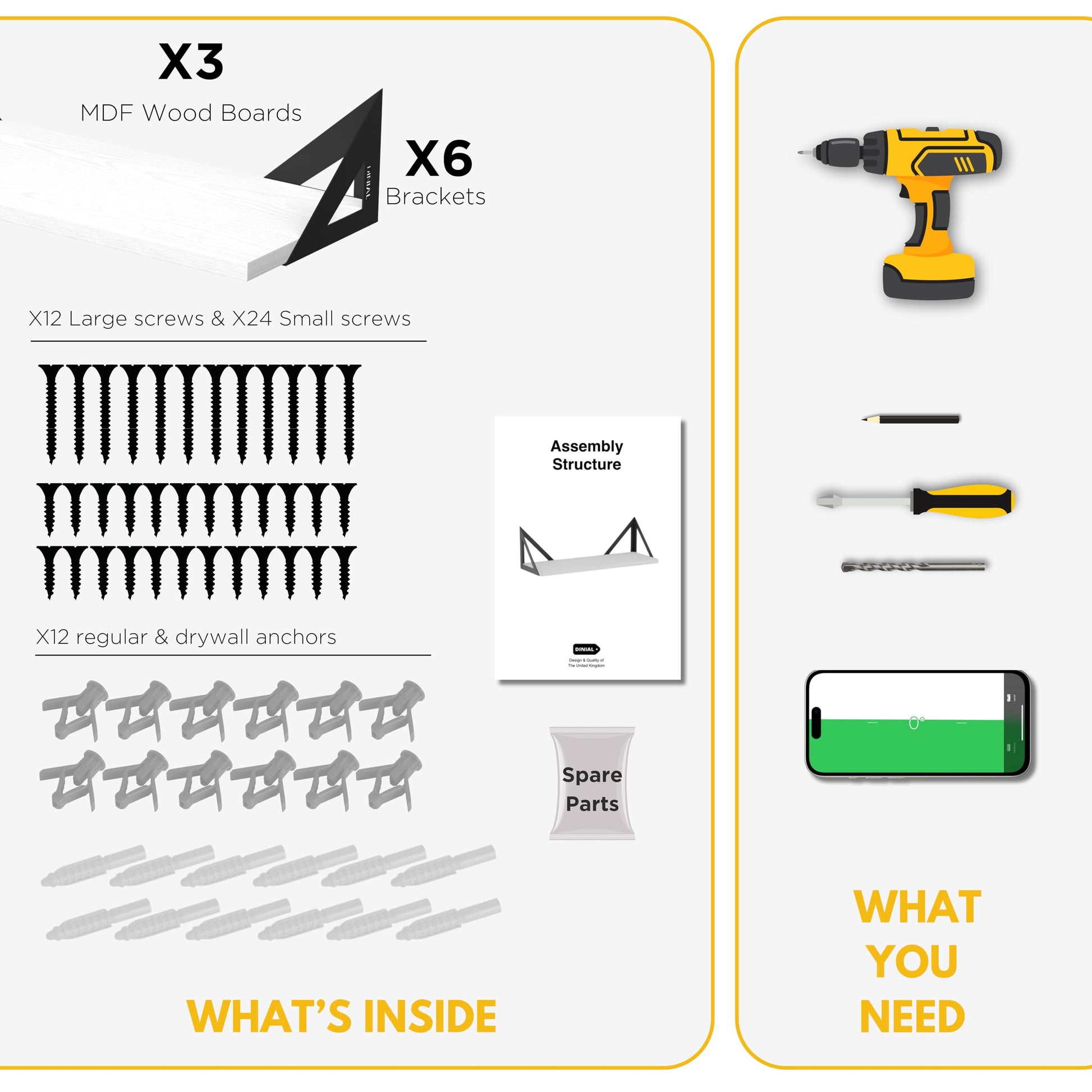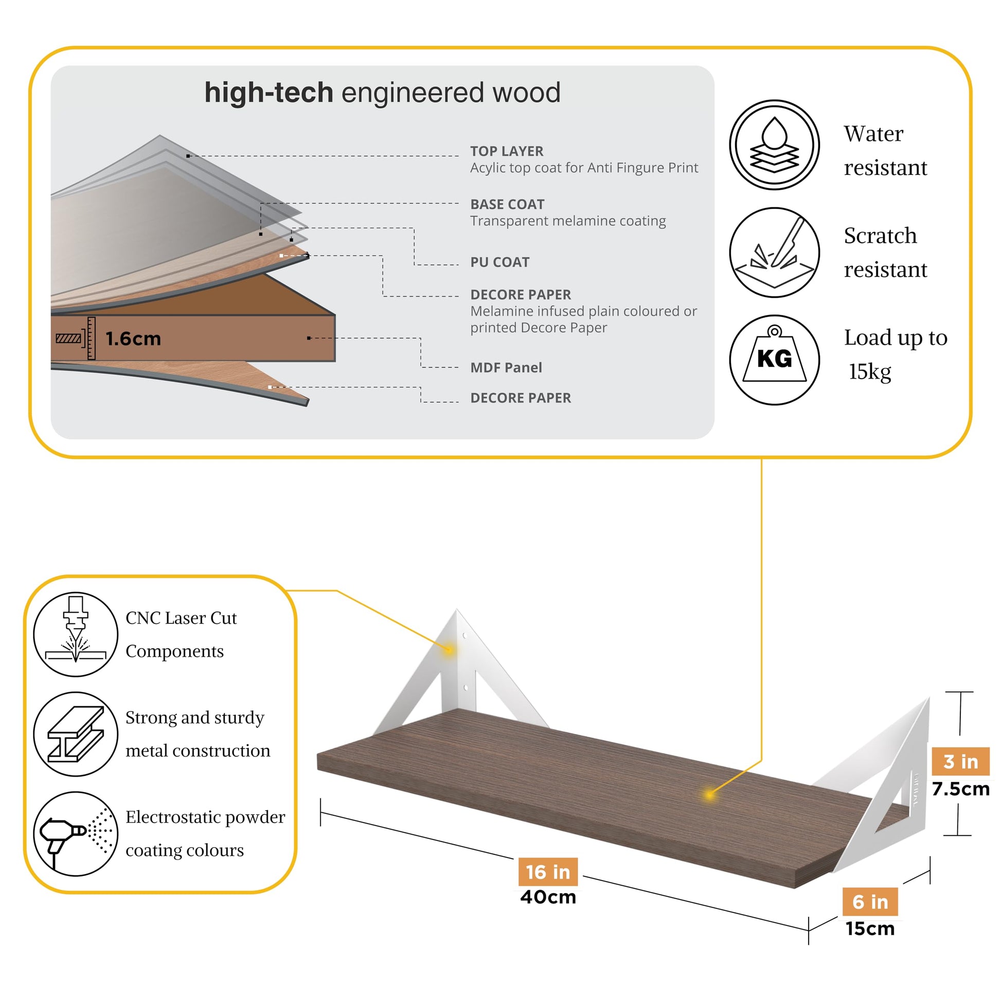 Upgrade your home's organization and style with Dinial's modern floating wall shelves. Crafted for easy assembly and premium quality, these 40x15 cm MDF wall shelves provide the perfect balance of lightweight convenience and robust strength. Each shelf supports up to 20kg, making them ideal for storing books, decorative items, or kitchen essentials. Whether you're enhancing storage in your living room, bedroom, kitchen, or office, Dinial shelves come in 5 beautiful colours, offering a sleek, modern look that complements any décor. The metal brackets, available in matte black or white, add a sturdy yet stylish touch to the design, ensuring these shelves are both functional and decorative. Designed in the UK, Dinial shelves are crafted from high-quality MDF to ensure durability and long-lasting use. Installation is a breeze with the included hardware and detailed manual, allowing you to set up your new floating shelves in minutes. Perfect for anyone looking to add both function and style to their home, these versatile display shelves are the ideal solution.