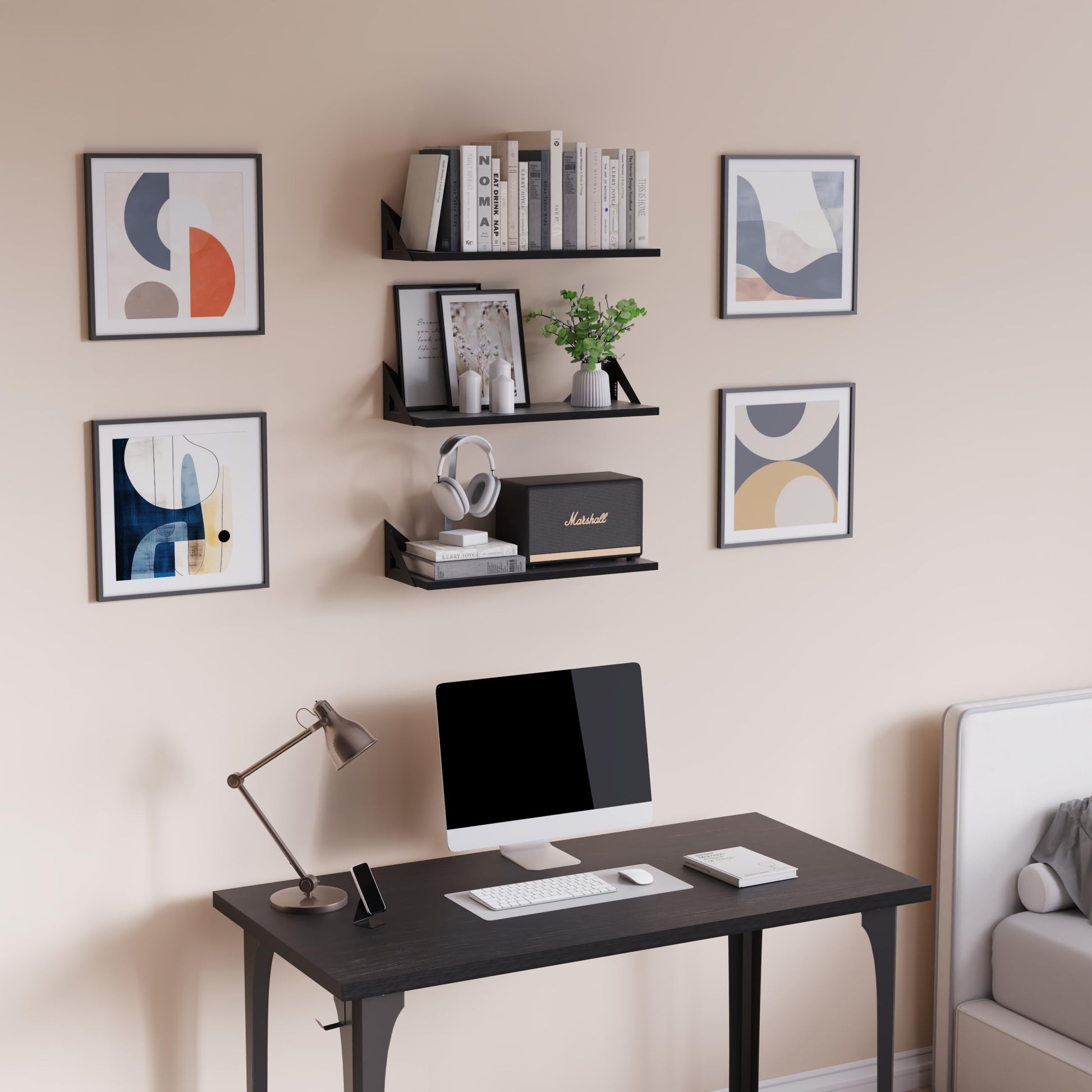 DINIAL Wall Mounted Floating Shelves for Wall Set of 3, Shelf Bookshelf for Bedroom Living Room Office Bathroom Kitchen Rustic Wood with Metal Bracket 02H-03