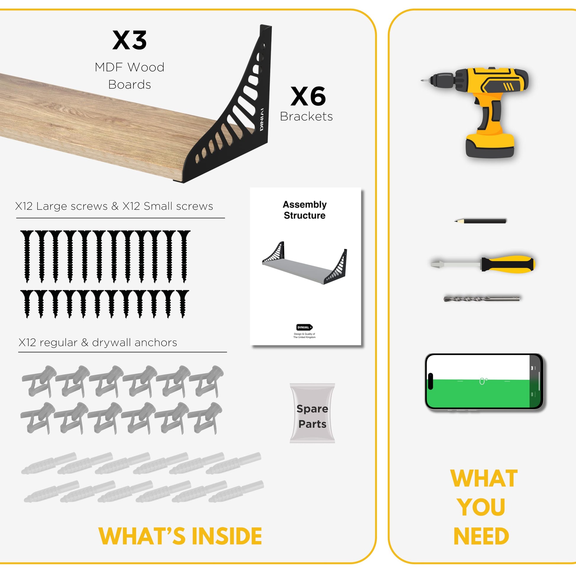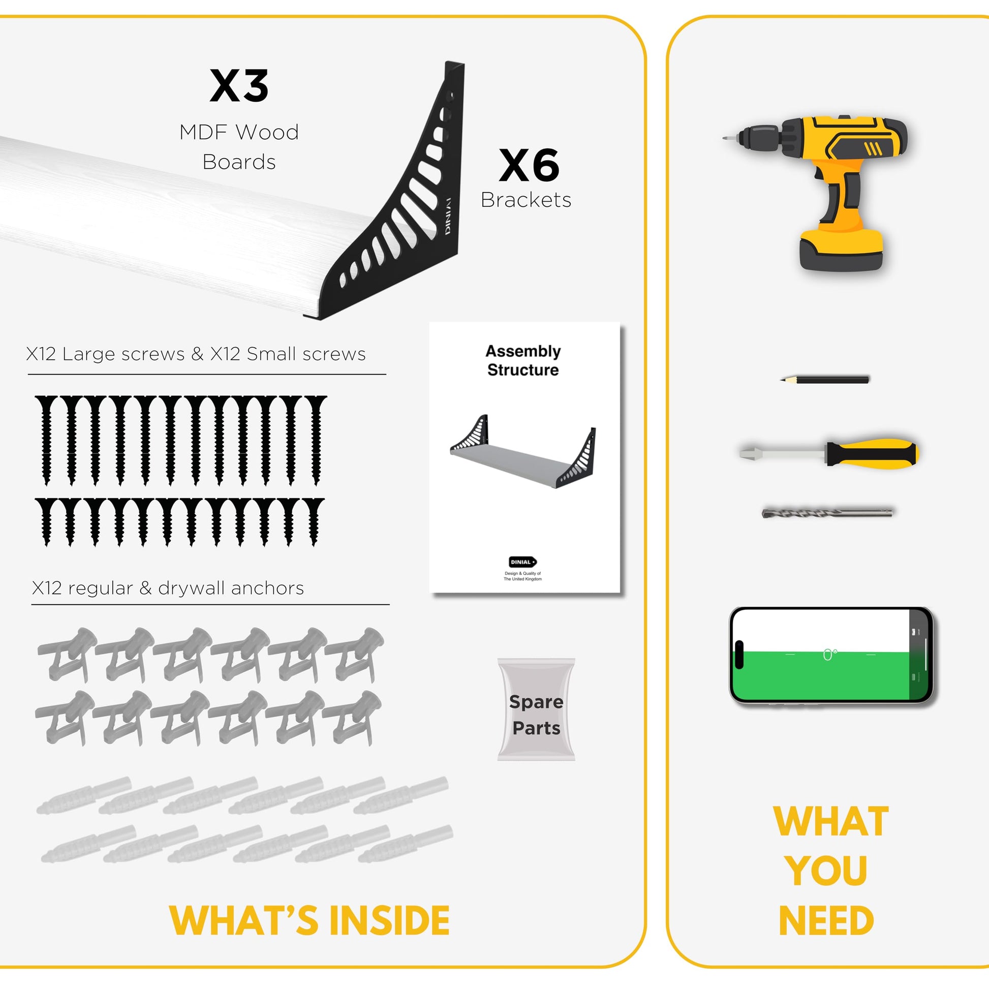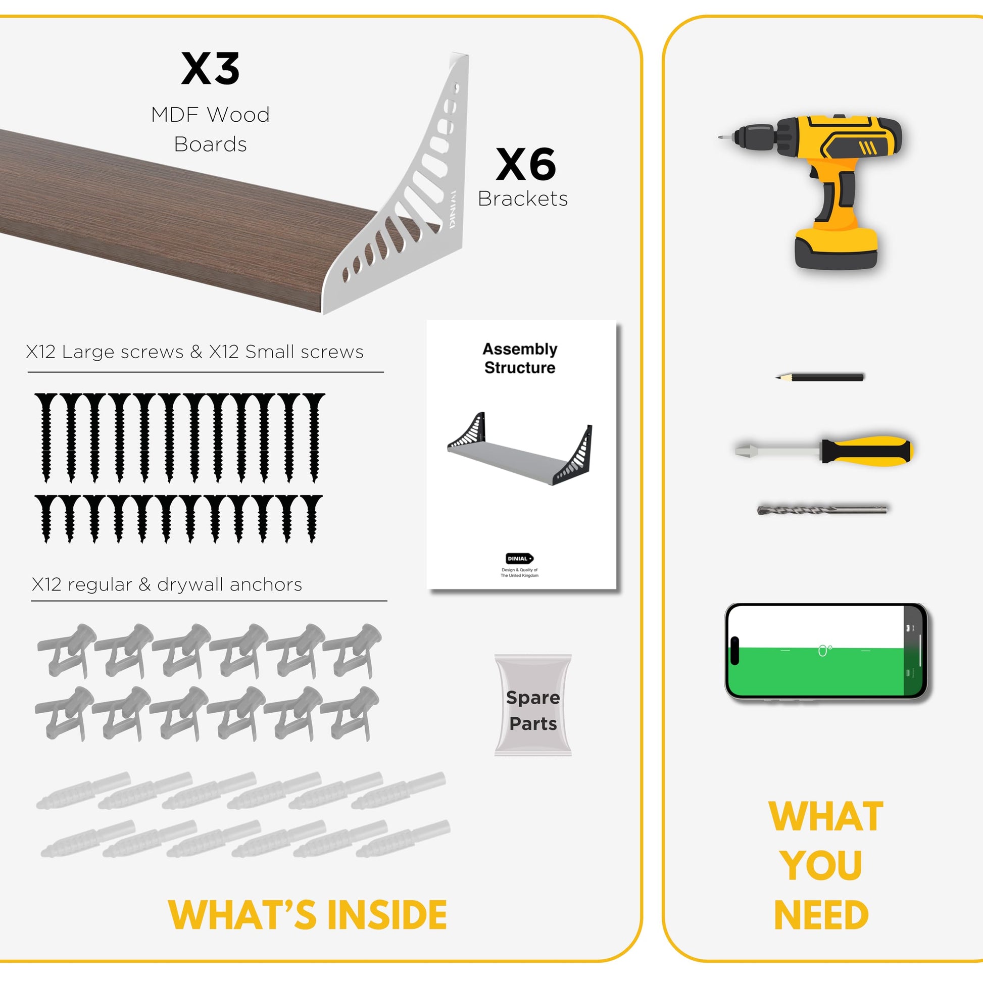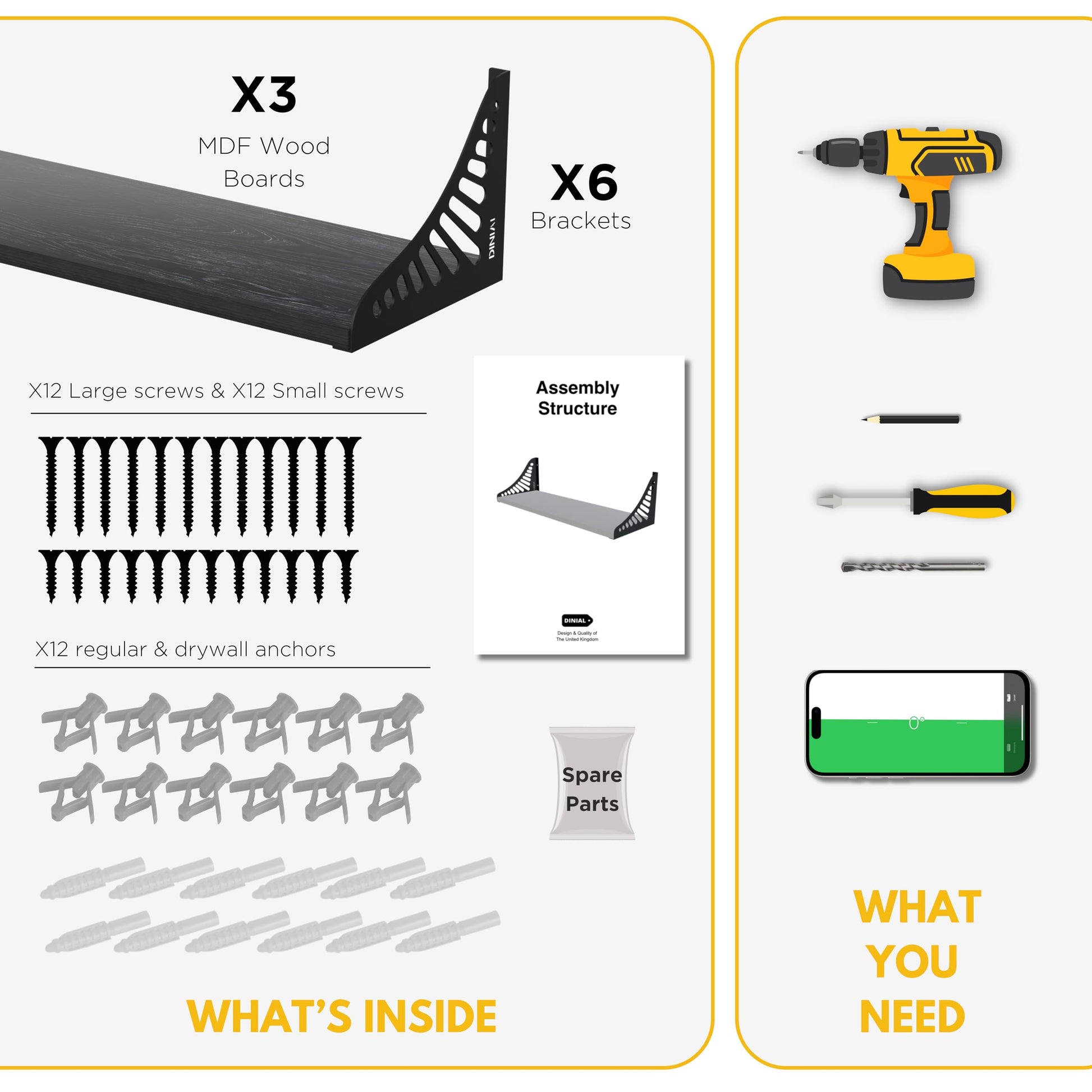 Upgrade your home's organization and style with Dinial's modern floating wall shelves. Crafted for easy assembly and premium quality, these 40x15 cm MDF wall shelves provide the perfect balance of lightweight convenience and robust strength. Each shelf supports up to 20kg, making them ideal for storing books, decorative items, or kitchen essentials. Whether you're enhancing storage in your living room, bedroom, kitchen, or office, Dinial shelves come in 5 beautiful colours, offering a sleek, modern look that complements any décor. The metal brackets, available in matte black or white, add a sturdy yet stylish touch to the design, ensuring these shelves are both functional and decorative. Designed in the UK, Dinial shelves are crafted from high-quality MDF to ensure durability and long-lasting use. Installation is a breeze with the included hardware and detailed manual, allowing you to set up your new floating shelves in minutes. Perfect for anyone looking to add both function and style to their home, these versatile display shelves are the ideal solution.