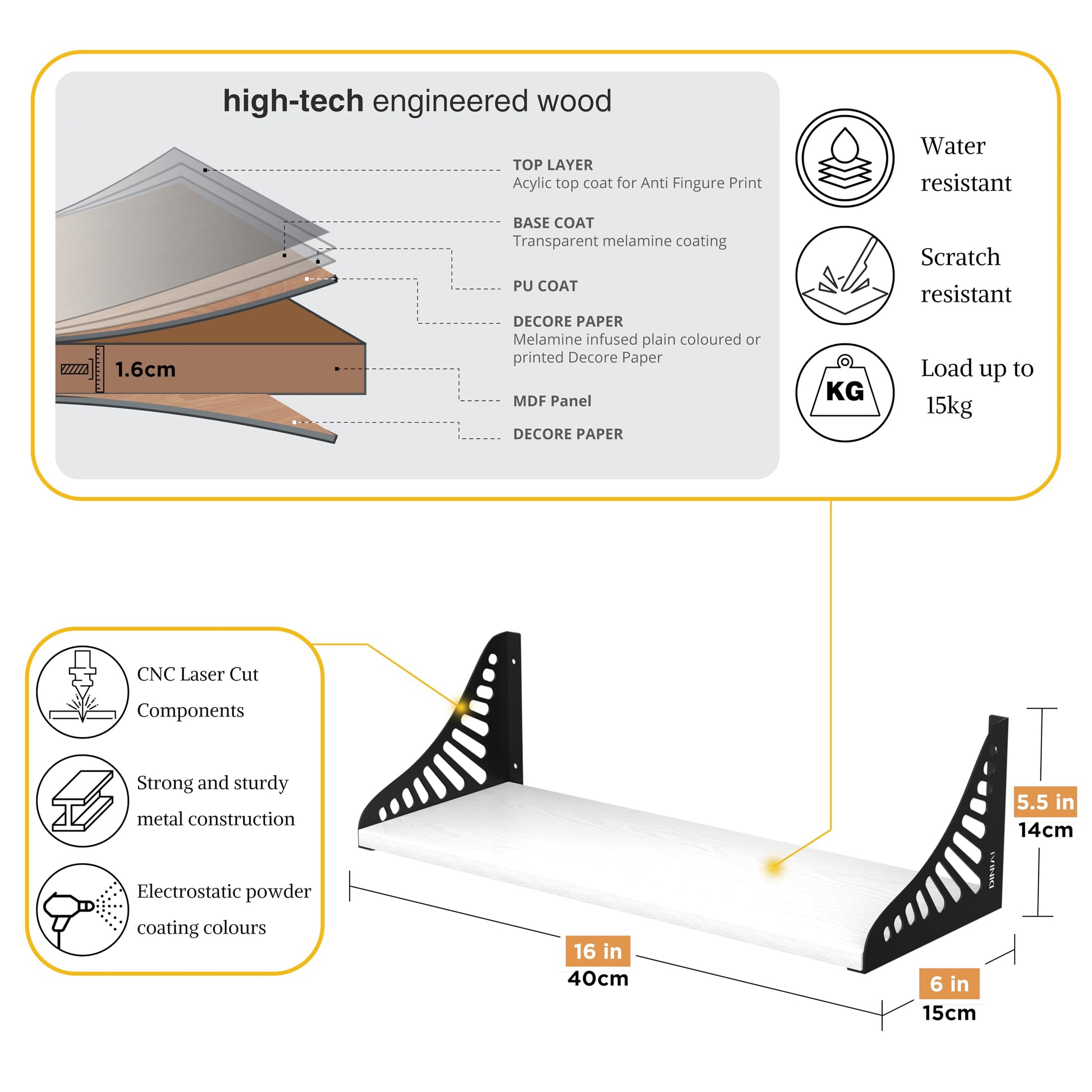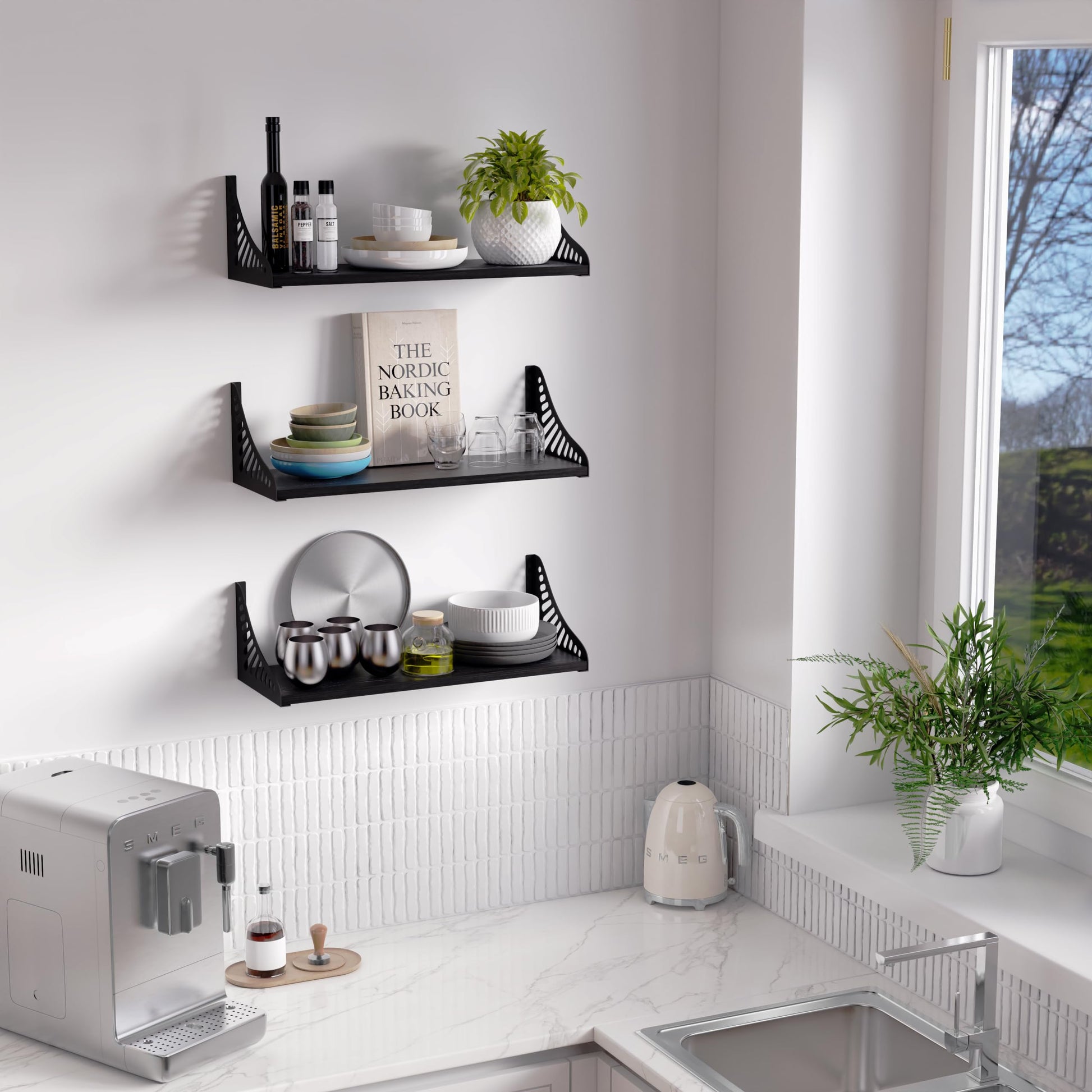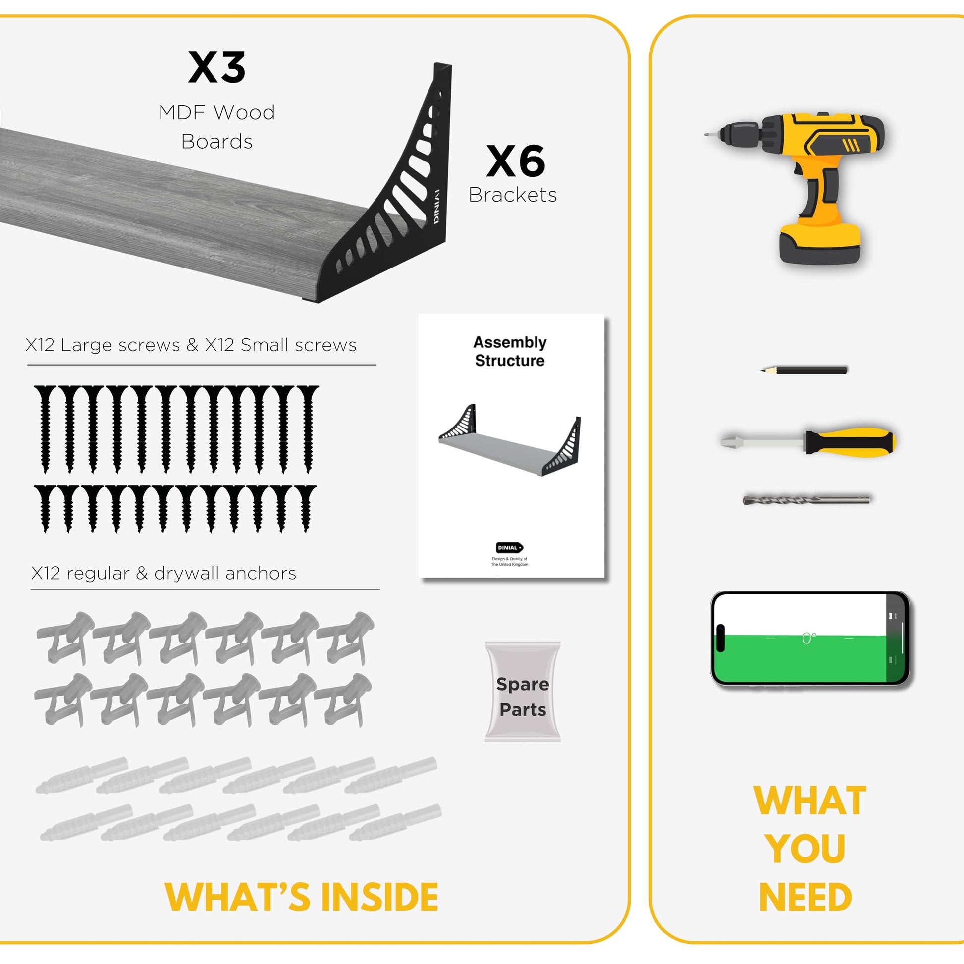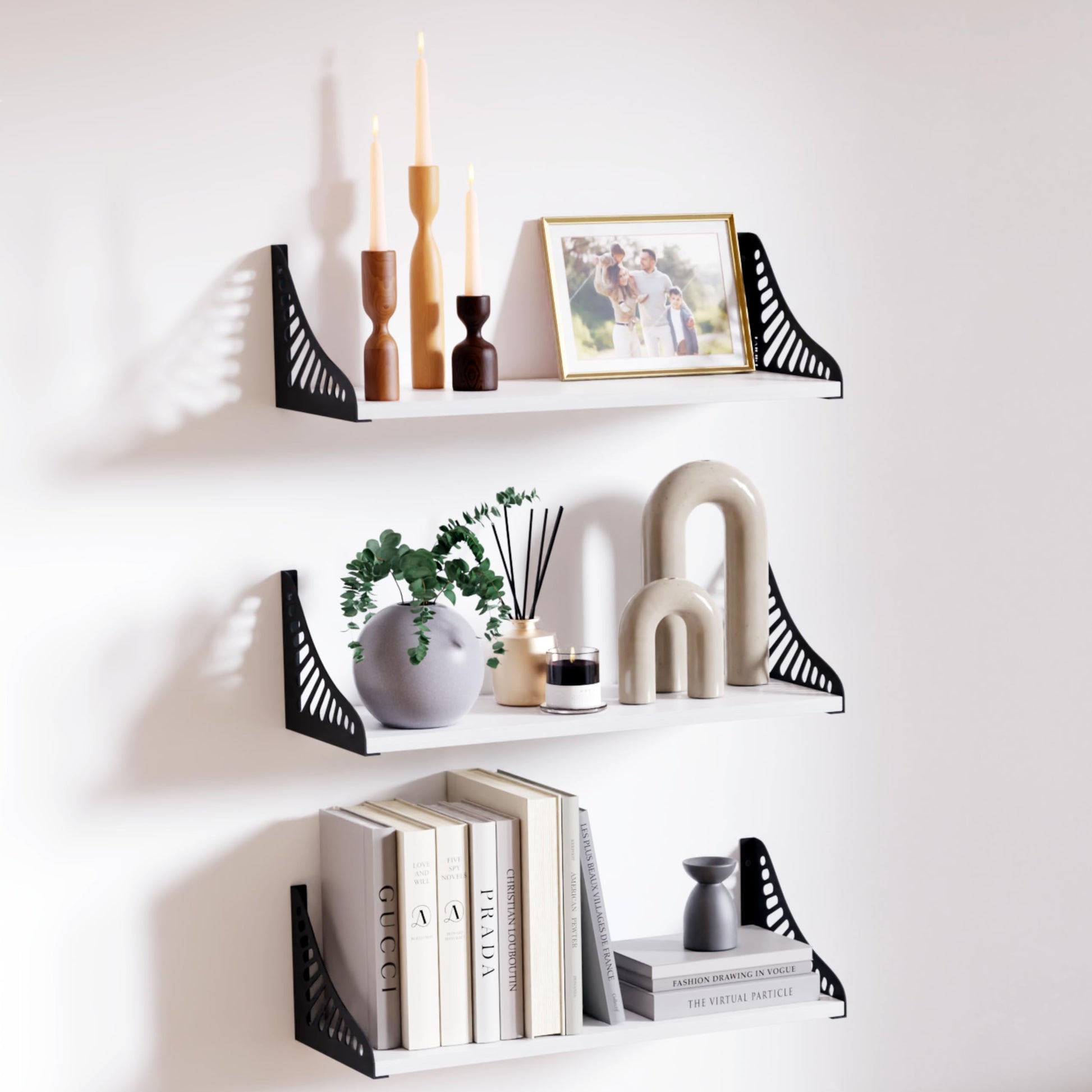 Upgrade your home's organization and style with Dinial's modern floating wall shelves. Crafted for easy assembly and premium quality, these 40x15 cm MDF wall shelves provide the perfect balance of lightweight convenience and robust strength. Each shelf supports up to 20kg, making them ideal for storing books, decorative items, or kitchen essentials. Whether you're enhancing storage in your living room, bedroom, kitchen, or office, Dinial shelves come in 5 beautiful colours, offering a sleek, modern look that complements any décor. The metal brackets, available in matte black or white, add a sturdy yet stylish touch to the design, ensuring these shelves are both functional and decorative. Designed in the UK, Dinial shelves are crafted from high-quality MDF to ensure durability and long-lasting use. Installation is a breeze with the included hardware and detailed manual, allowing you to set up your new floating shelves in minutes. Perfect for anyone looking to add both function and style to their home, these versatile display shelves are the ideal solution.