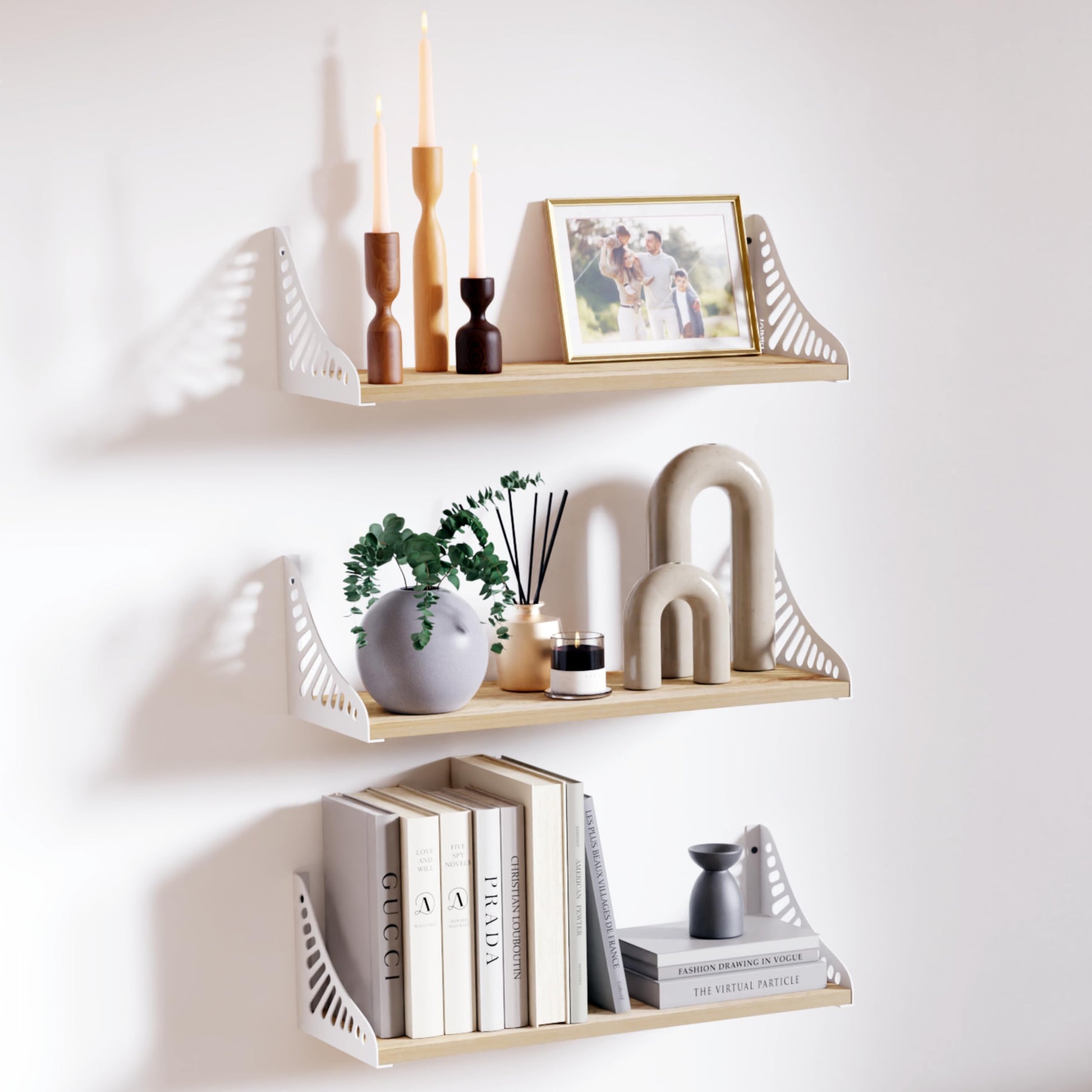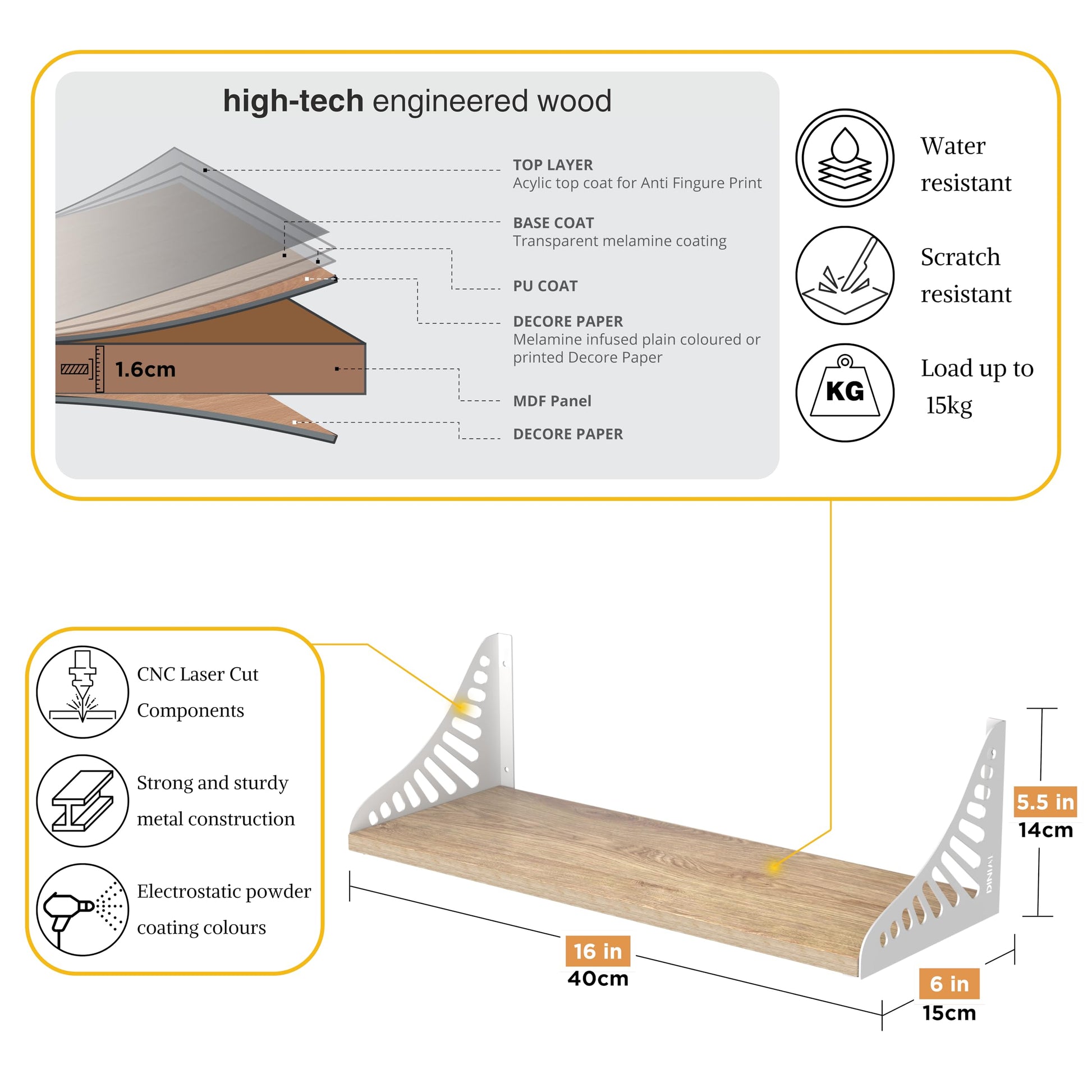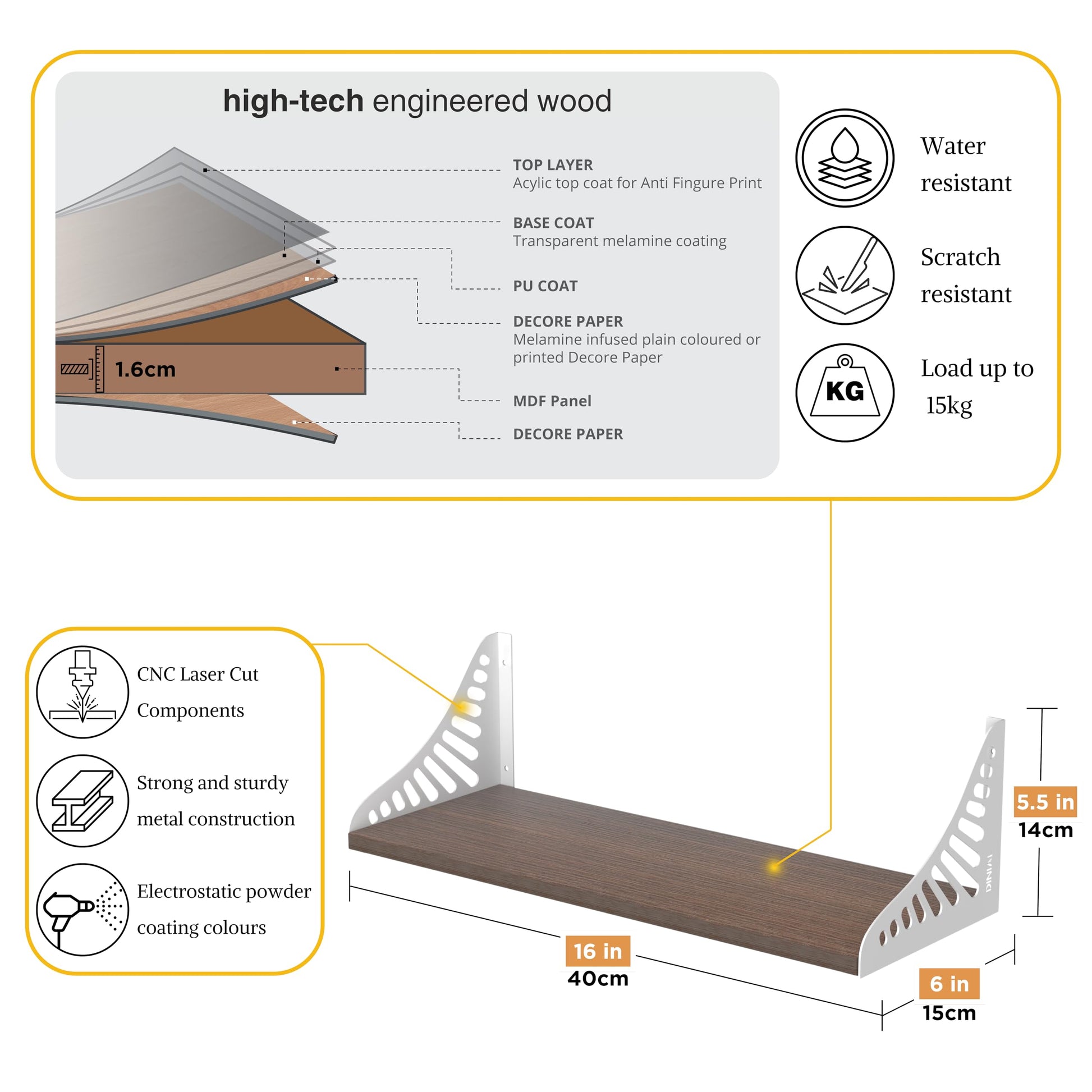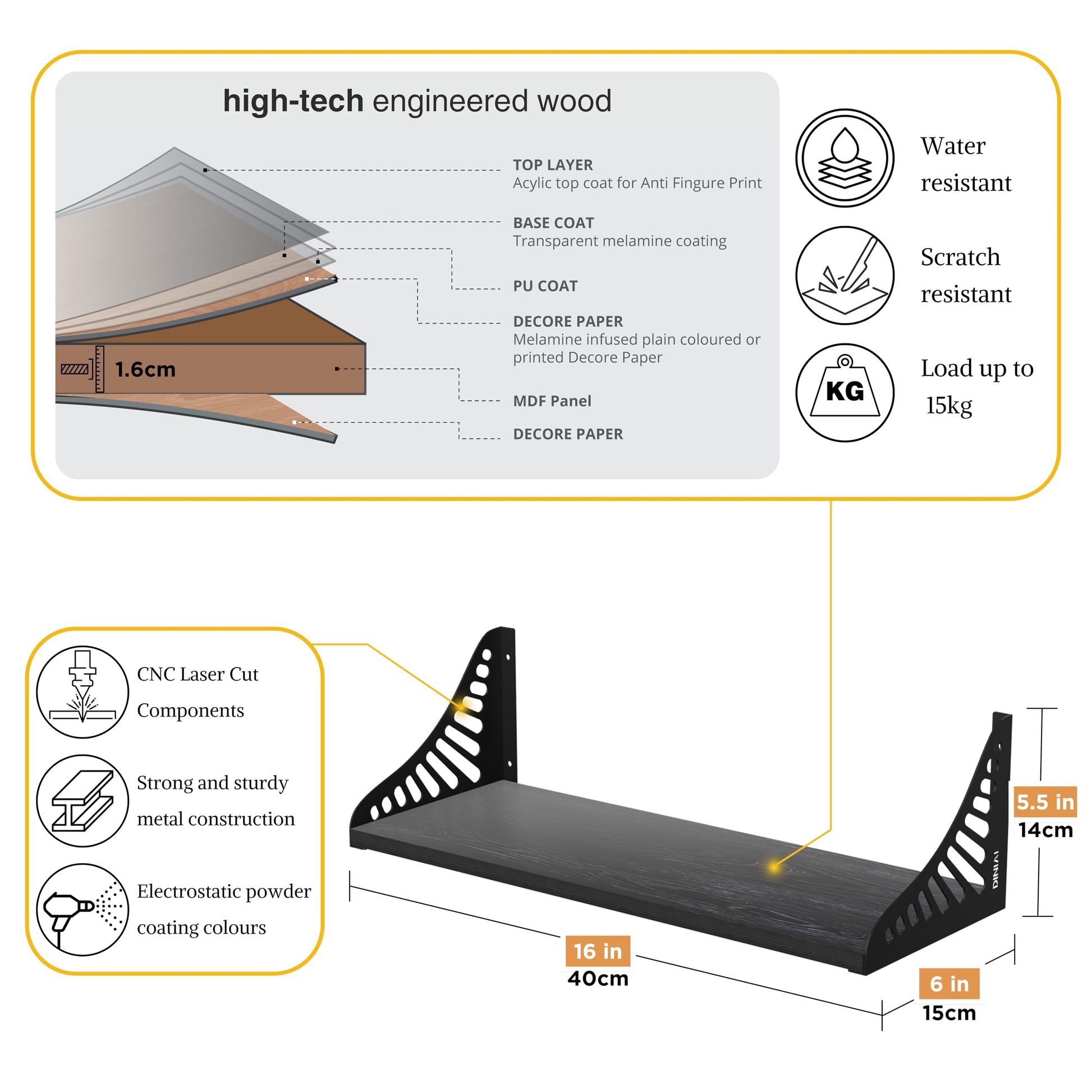 Upgrade your home's organization and style with Dinial's modern floating wall shelves. Crafted for easy assembly and premium quality, these 40x15 cm MDF wall shelves provide the perfect balance of lightweight convenience and robust strength. Each shelf supports up to 20kg, making them ideal for storing books, decorative items, or kitchen essentials. Whether you're enhancing storage in your living room, bedroom, kitchen, or office, Dinial shelves come in 5 beautiful colours, offering a sleek, modern look that complements any décor. The metal brackets, available in matte black or white, add a sturdy yet stylish touch to the design, ensuring these shelves are both functional and decorative. Designed in the UK, Dinial shelves are crafted from high-quality MDF to ensure durability and long-lasting use. Installation is a breeze with the included hardware and detailed manual, allowing you to set up your new floating shelves in minutes. Perfect for anyone looking to add both function and style to their home, these versatile display shelves are the ideal solution.