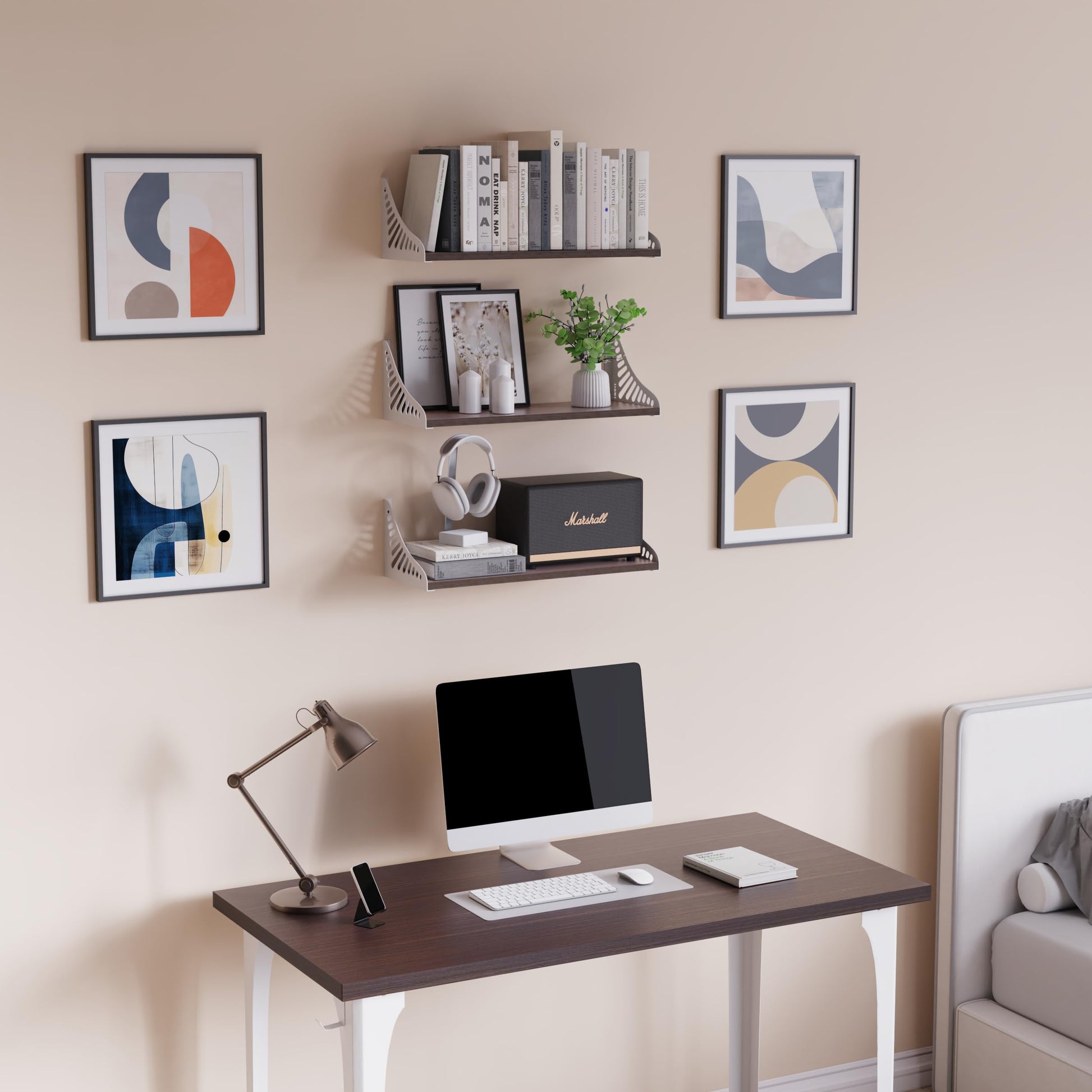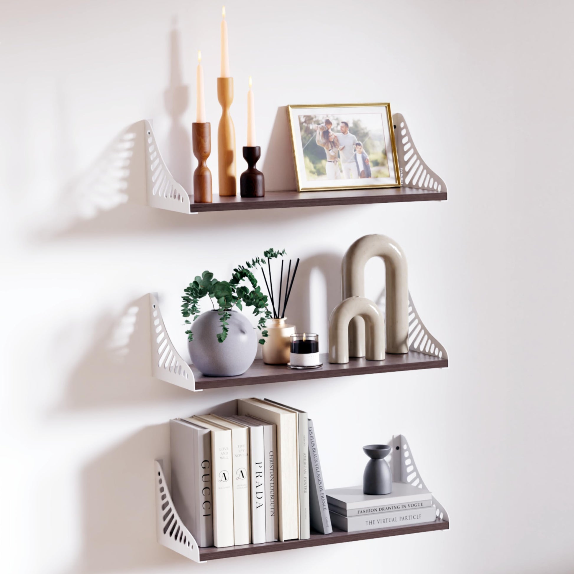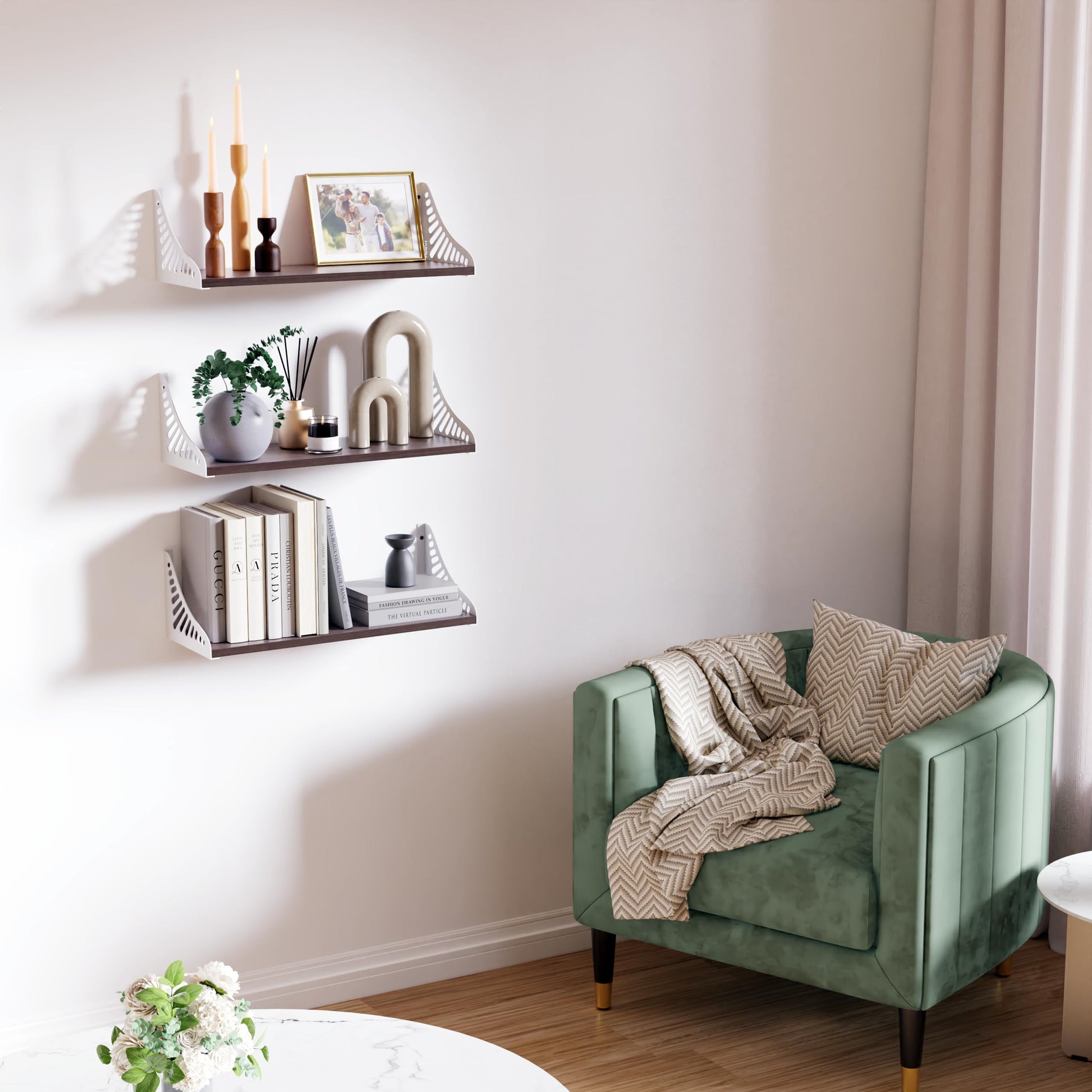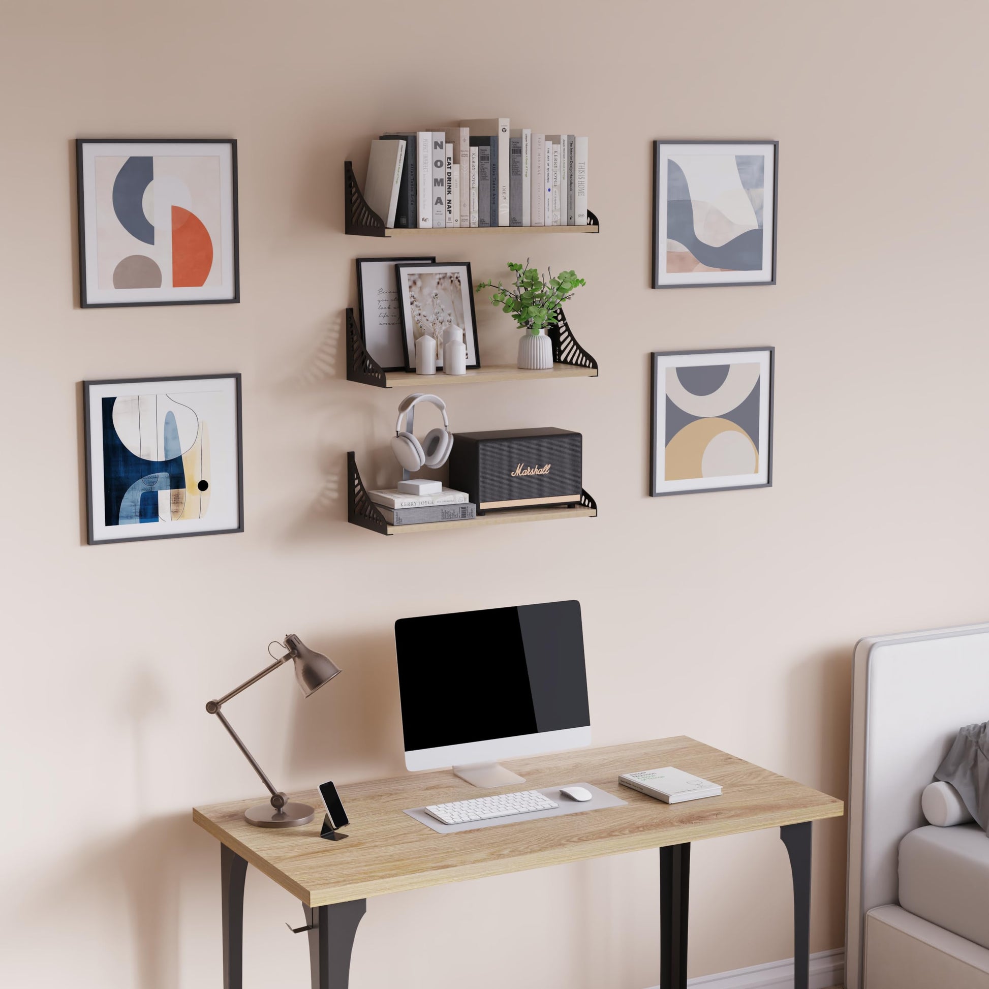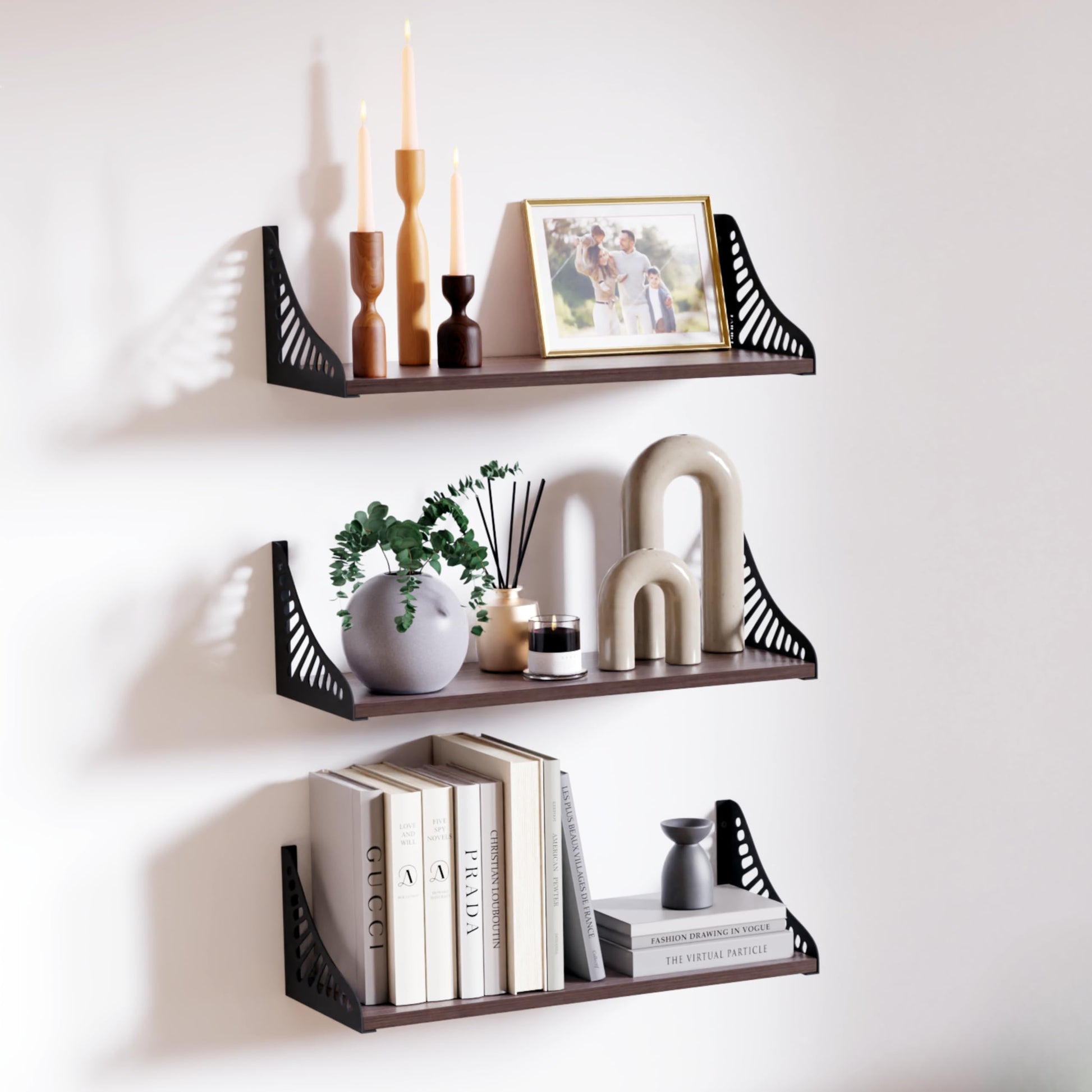 DINIAL Wall Mounted Floating Shelves for Wall Set of 3, Shelf Bookshelf for Bedroom Living Room Office Bathroom Kitchen Rustic Wood with Metal Bracket 04