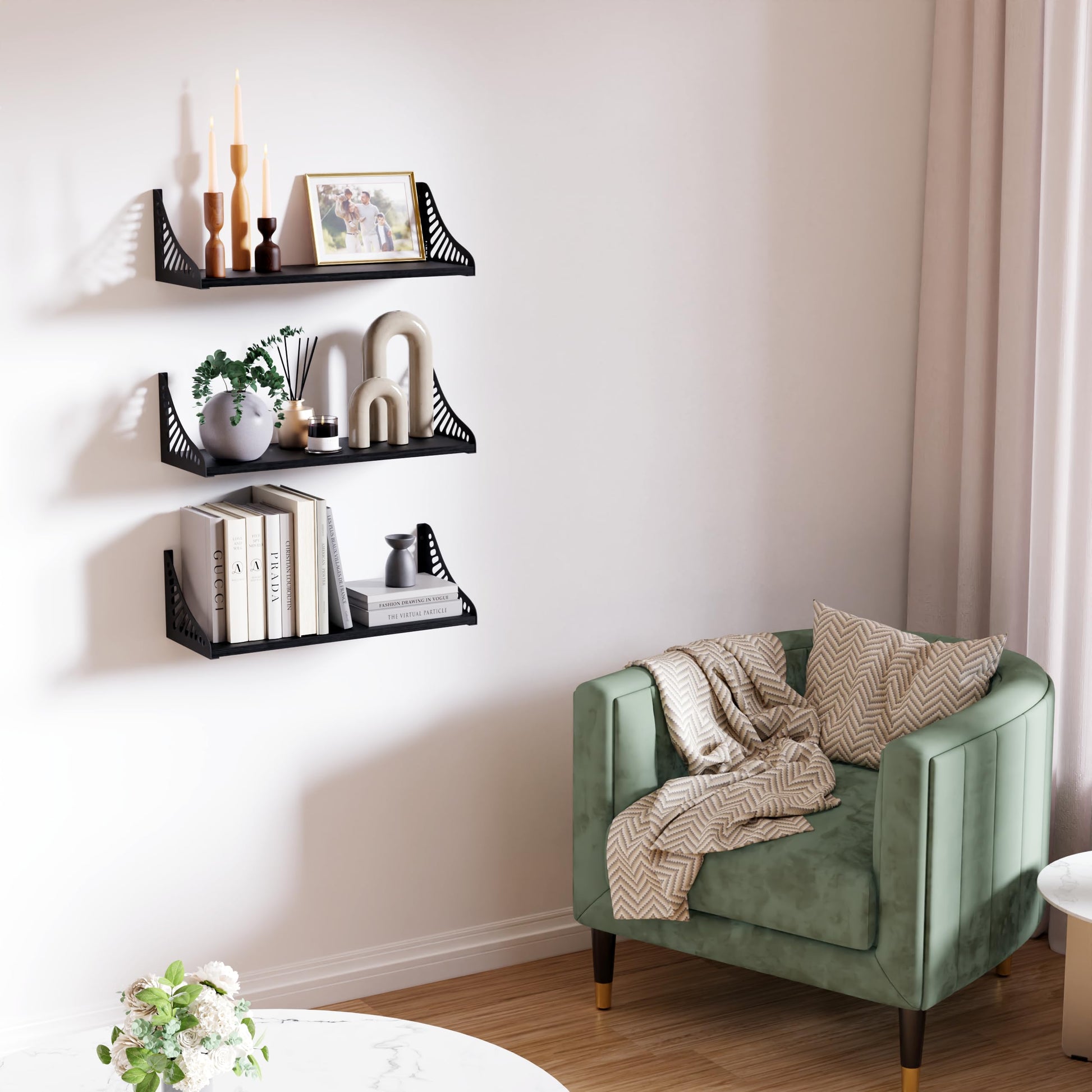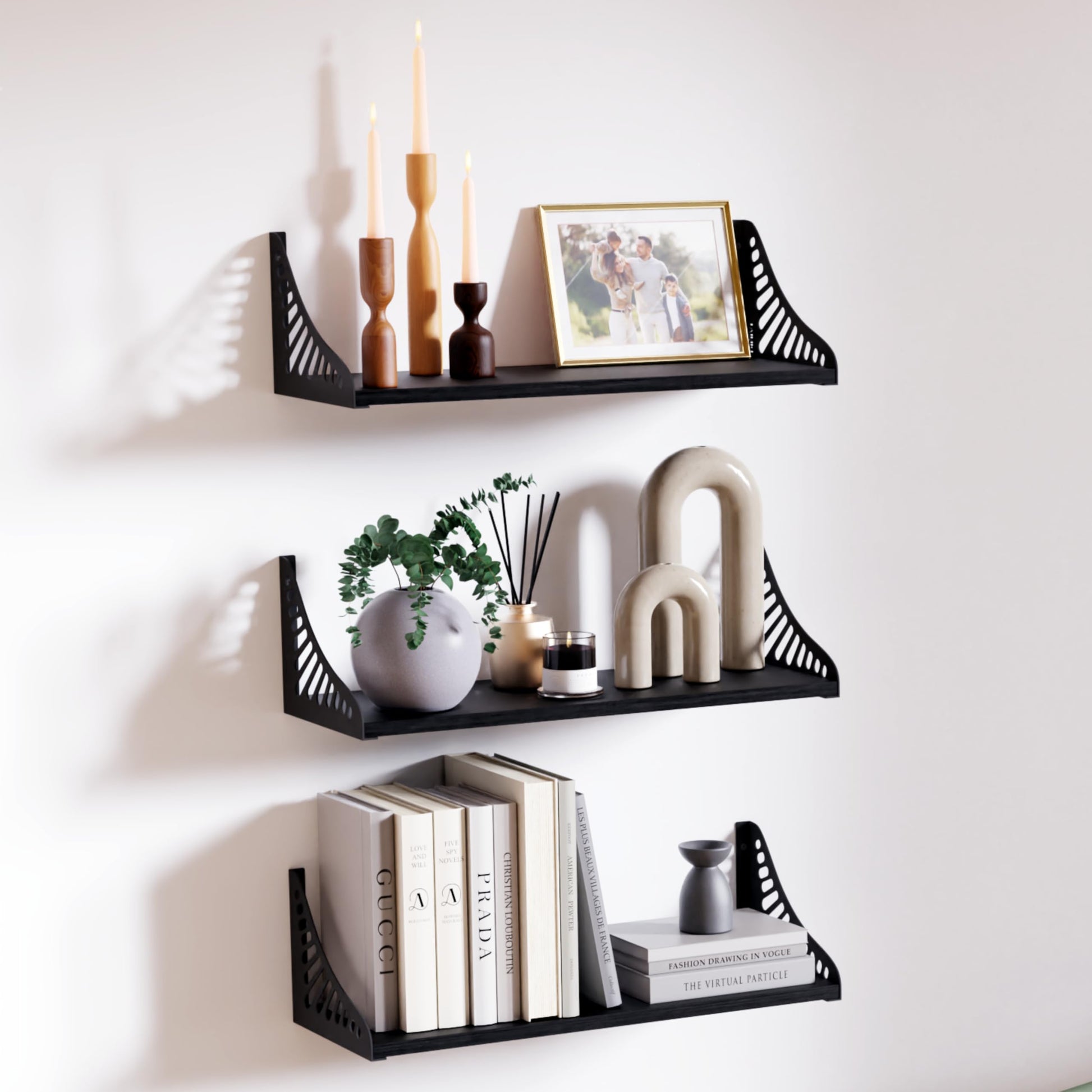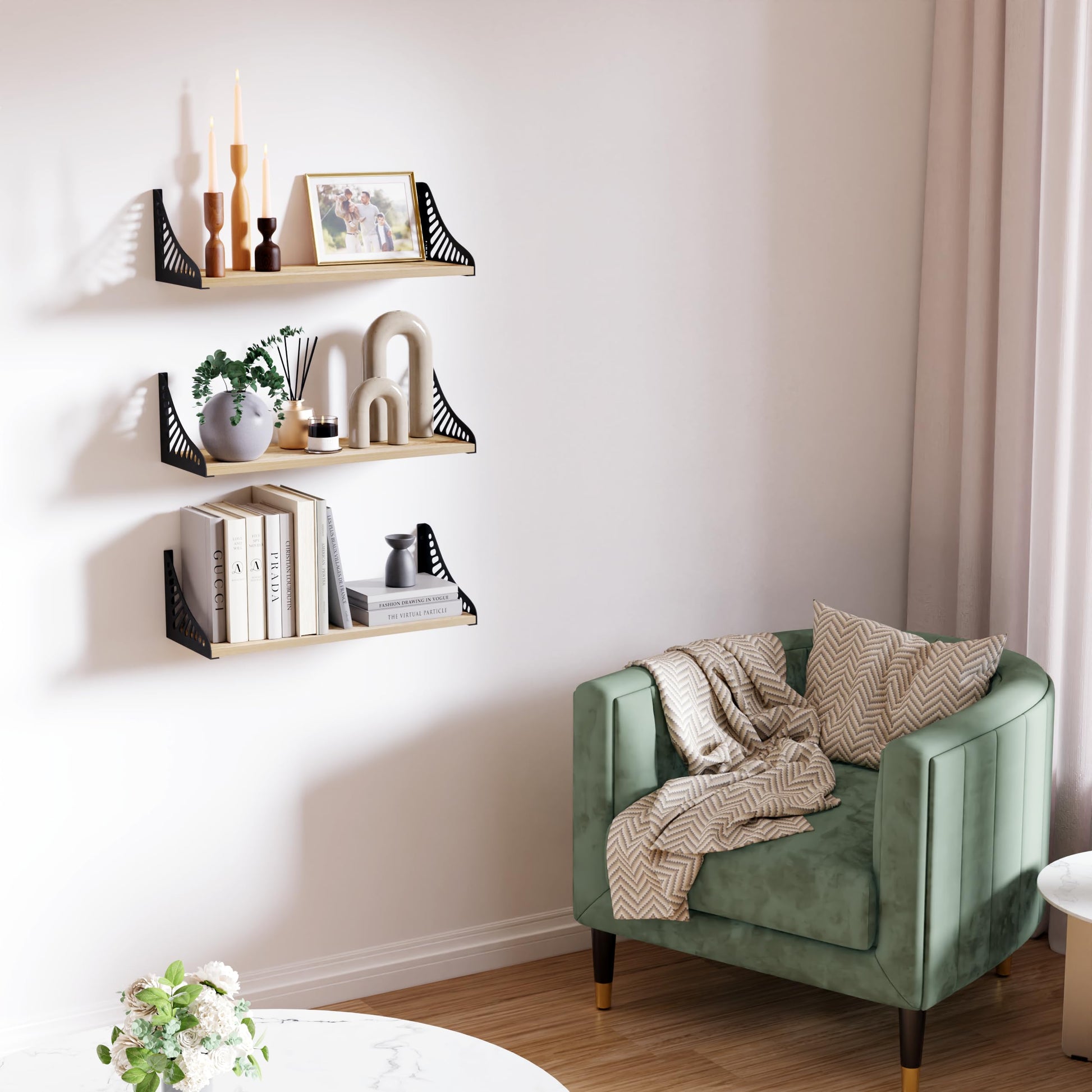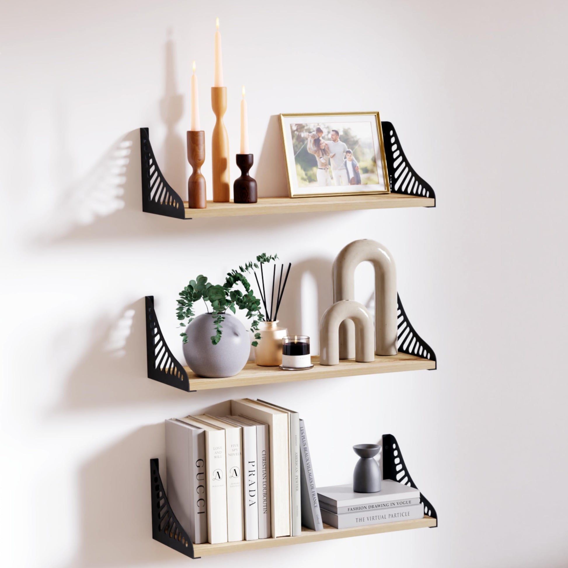 DINIAL Wall Mounted Floating Shelves for Wall Set of 3, Shelf Bookshelf for Bedroom Living Room Office Bathroom Kitchen Rustic Wood with Metal Bracket 04