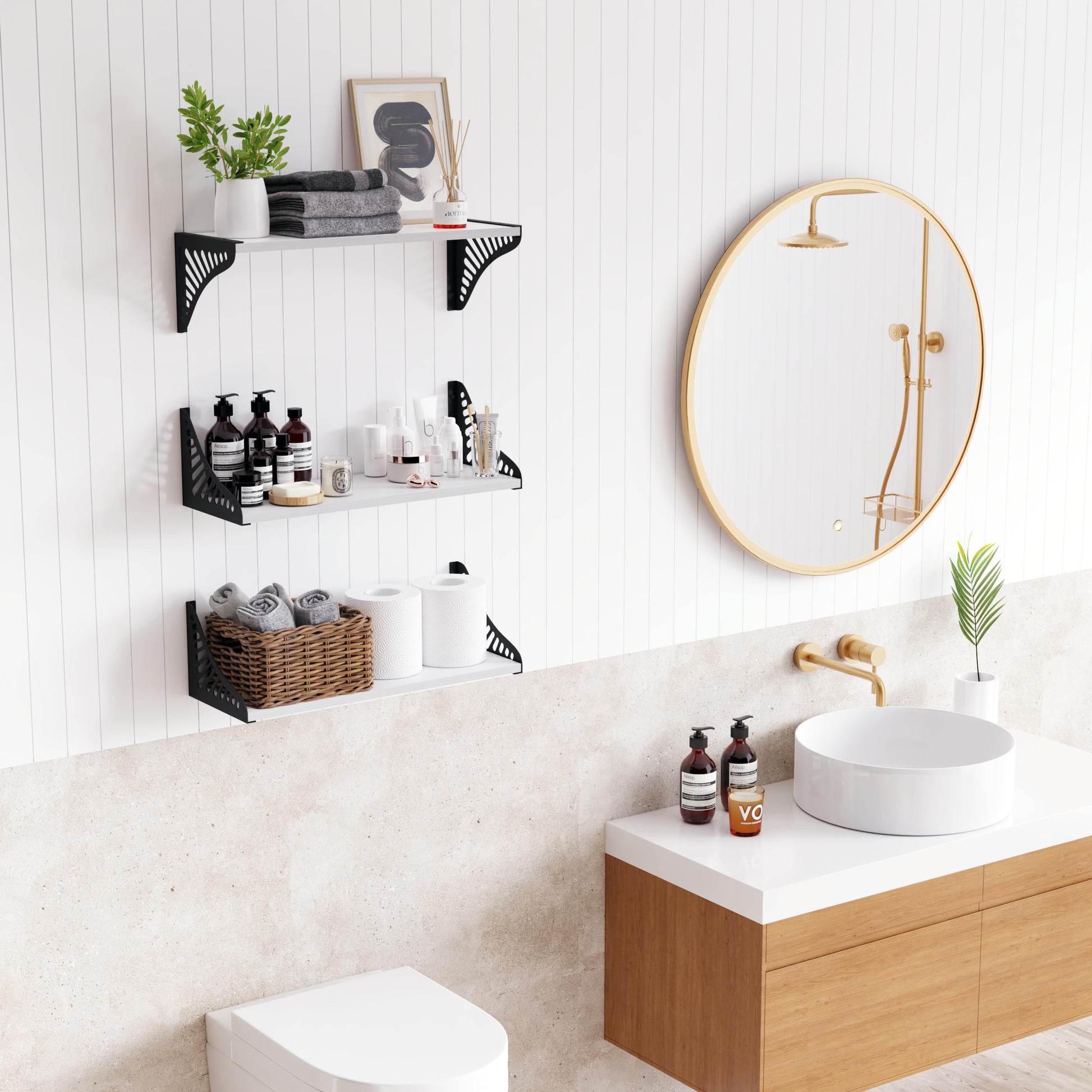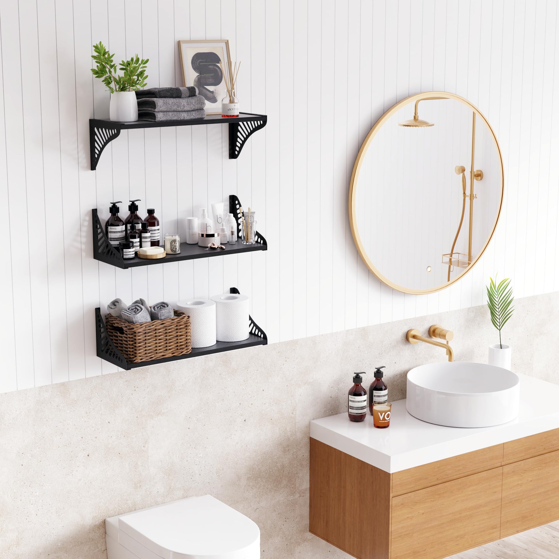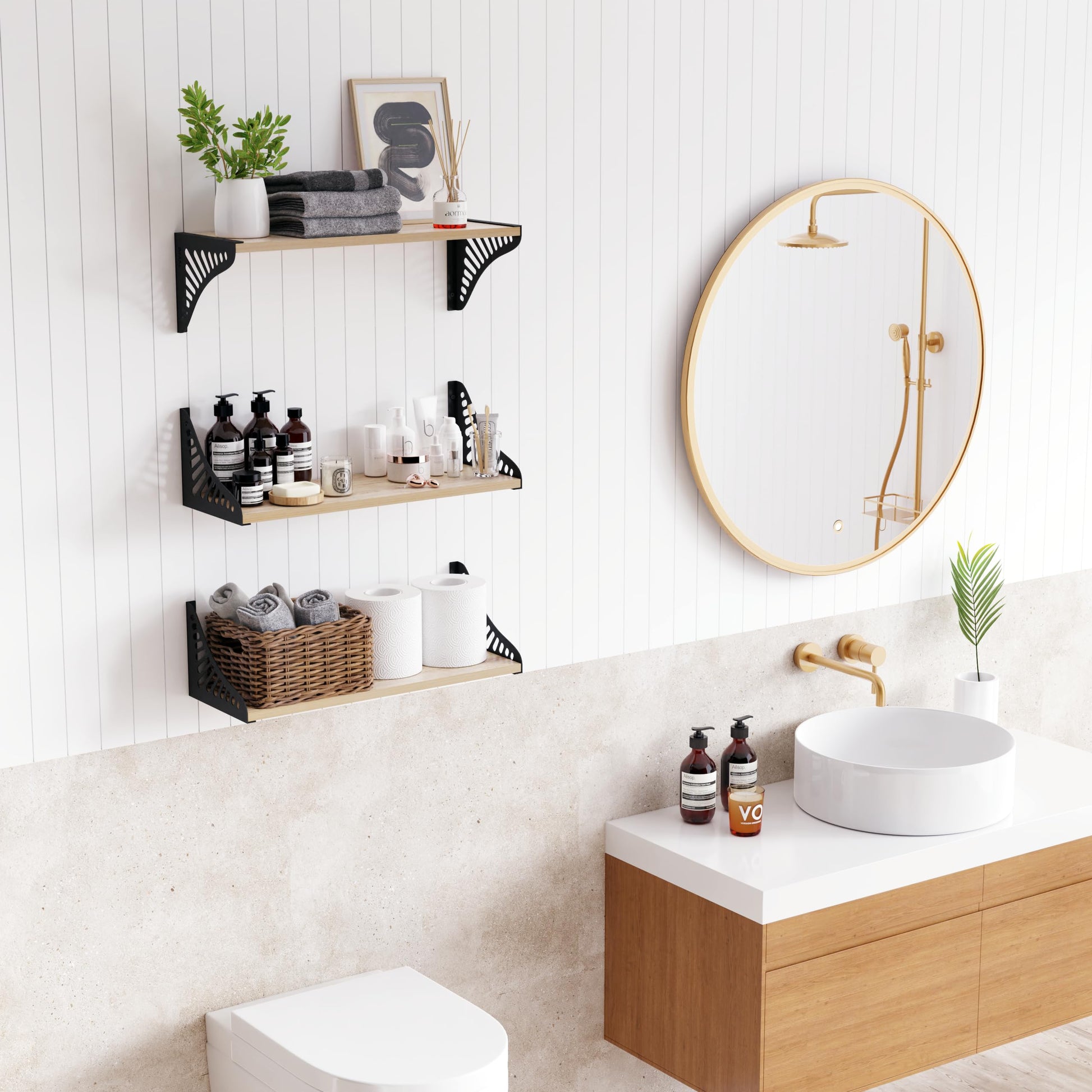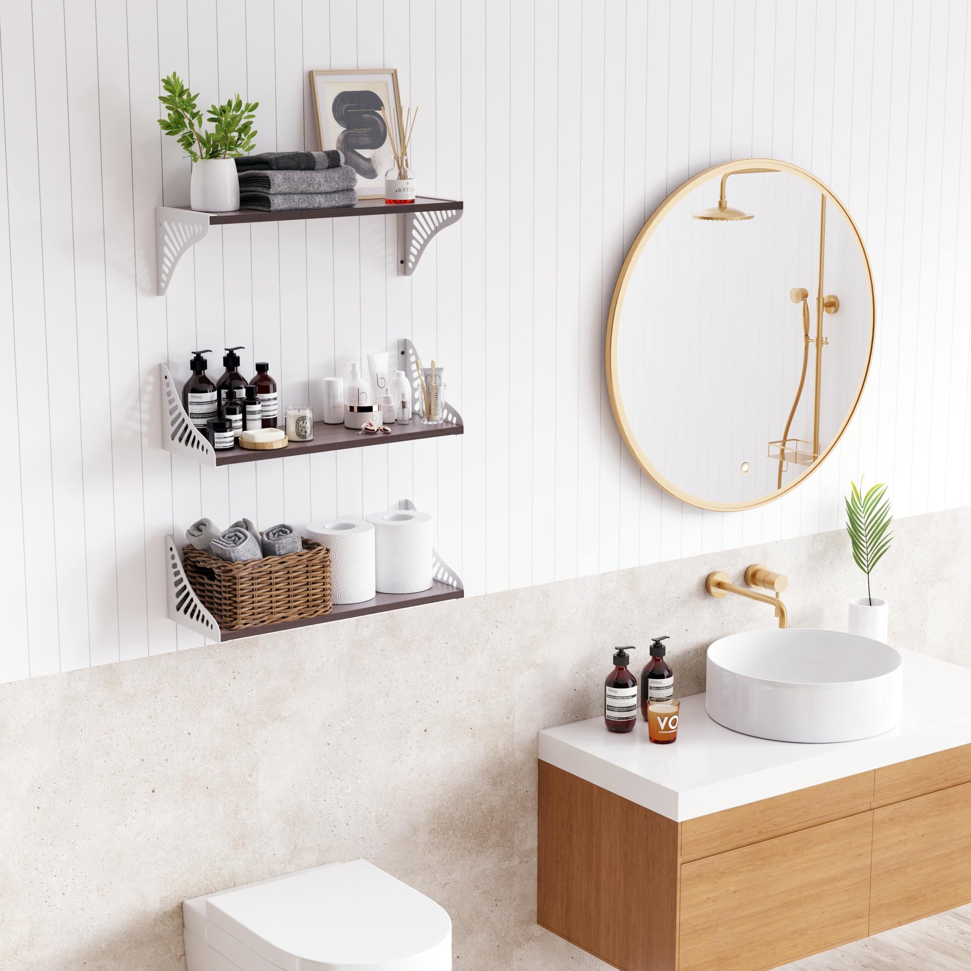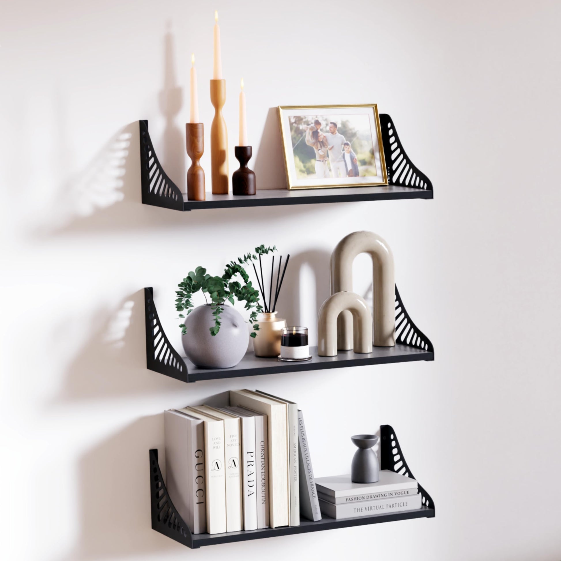 DINIAL Wall Mounted Floating Shelves for Wall Set of 3, Shelf Bookshelf for Bedroom Living Room Office Bathroom Kitchen Rustic Wood with Metal Bracket 04